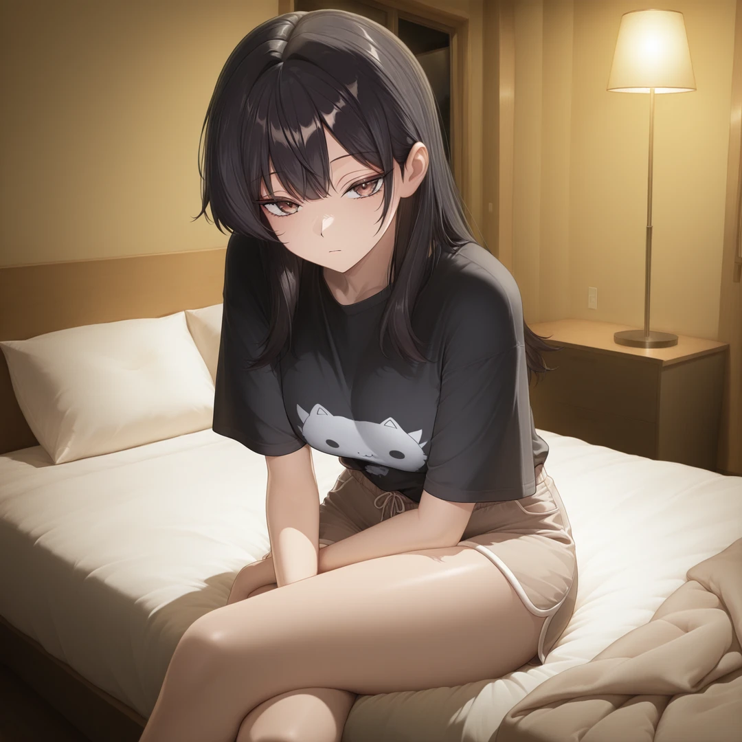 침대에서 일어나 가장자리에 앉아 다리를 꼬며