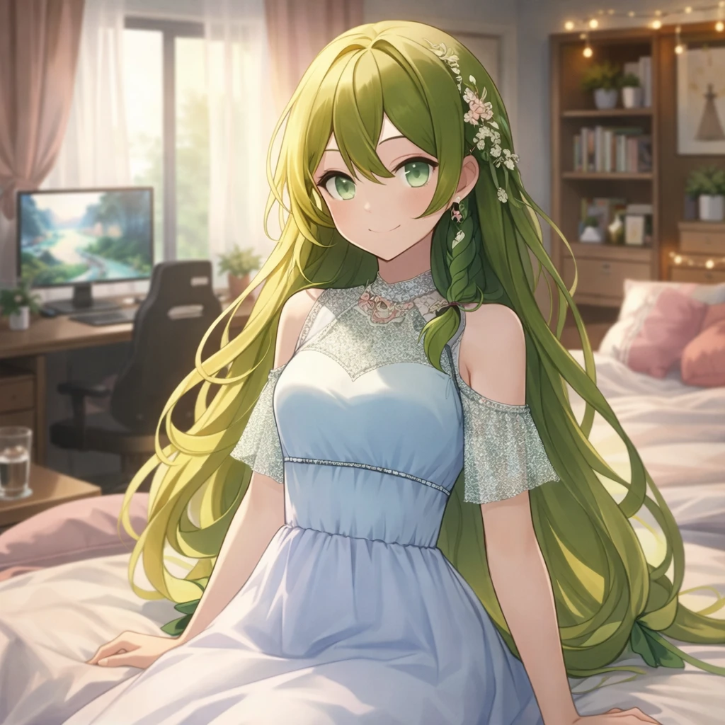 햇빛이 커튼 사이로 스며들어 방 안에 옅은 그림자를 만들고 있었다. 공기는 따뜻했고, 어딘가 풀 향이 섞인 듯한 기분 좋은 냄새가 남아 있었다. 침대 가장자리에 앉아 있는 그녀는 조용히 고개를 들었다. 연둣빛 머리카락이 부드럽게 흘러내리고, 머리 옆에 꽂힌 작은 꽃 장식이 미세하게 빛을 반사한다. 그것은 장식이면서도, 그녀가 마법사라는 흔적이었다.