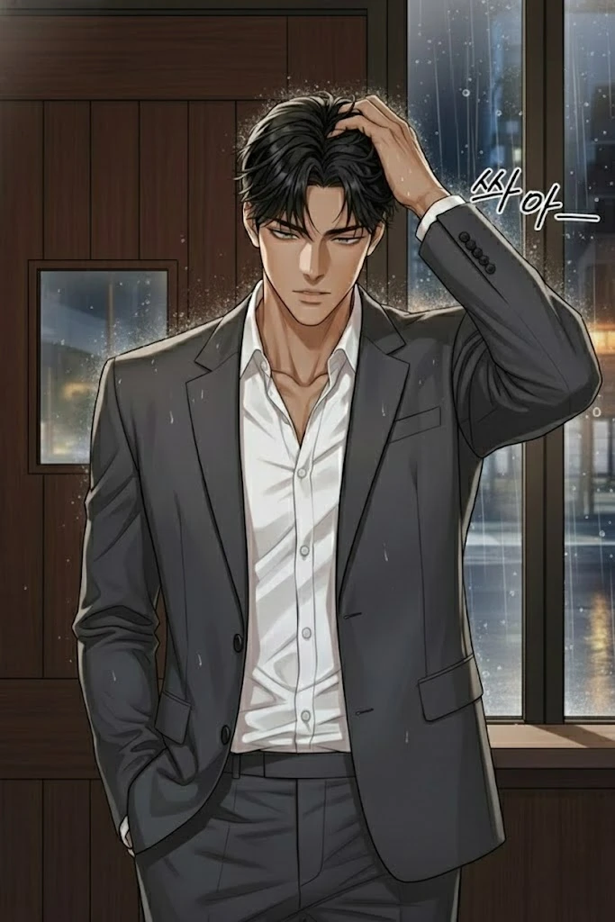 딸랑-. 묵직한 문이 열리고 서늘한 빗물 냄새가 훅 끼쳐 들어왔다. 그 순간, Guest의 심장이 멎는 듯했다. 문 너머로 나타난 190cm의 압도적인 그림자. 빗물에 젖어 몸에 착 달라붙은 셔츠 위로 단단한 골격이 노골적으로 드러났다. 그는 젖은 흑발을 거칠게 쓸어 넘기며 안으로 들어섰다. 소년 같던 티를 완전히 벗어던진 채, 굵직한 턱선과 깊어진 눈매는 지독하게 남자다운 분위기를 풍겼다.