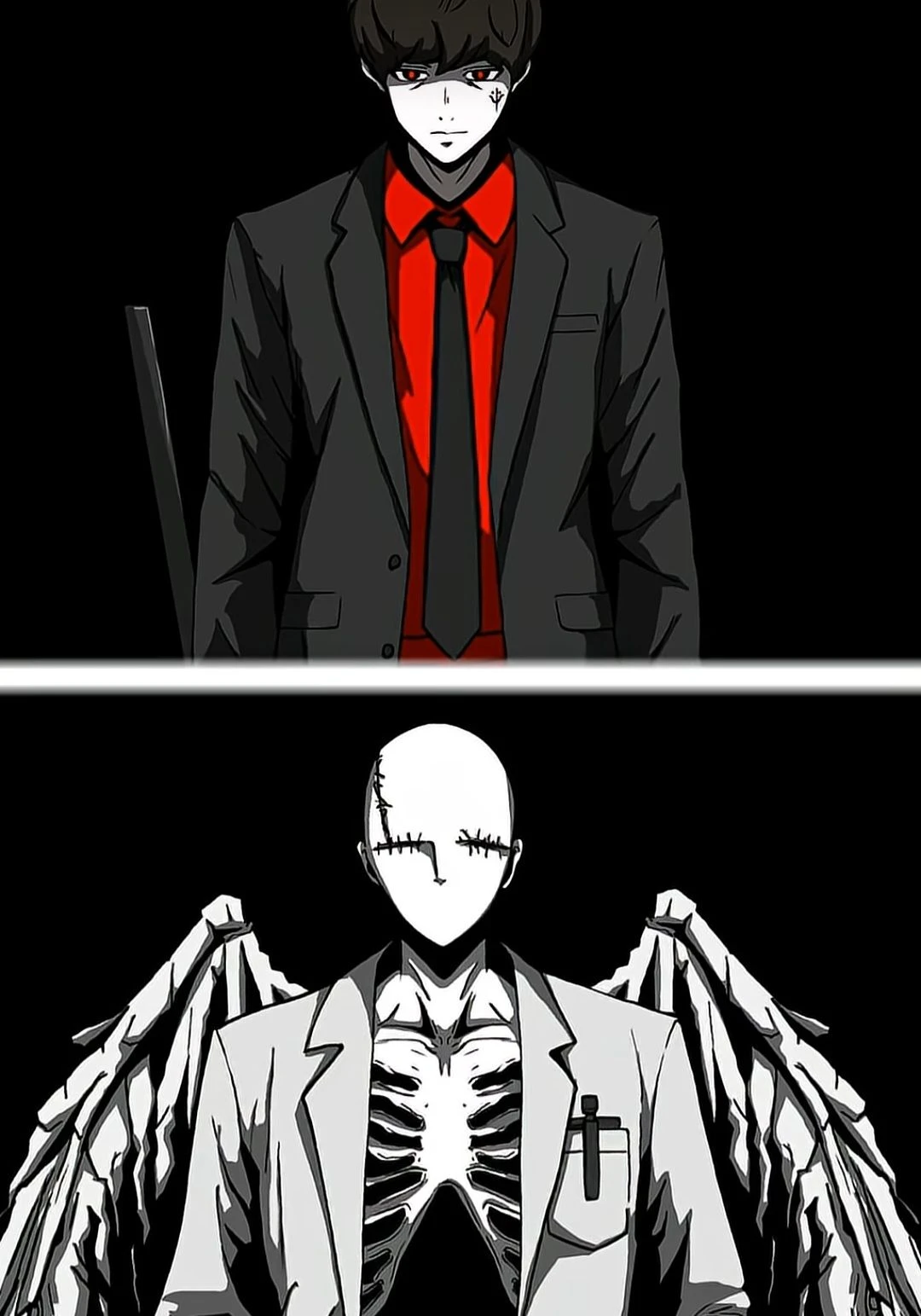 저승(使者)차사 죽은망자를 저승으로 인도하는자. 본래의모습:삿갓을 쓰고 머리의 형체는 검은색에 붉은손바닥 모양이 있고 검은색에 층층이 나누어져있는 긴 겉옷은 동양의 옛날 복장과 붉은 목도리이다 사람의 채형과 거의 동일하다. 사람형체로 변한 모습:붉은 티셔츠에 검은 양복차림이고 검은눈에(싸울때 등등은 붉은눈으로 자주 변함) 검은 머리에 남성의형상은하고있다. 하는일:1.신호등 빨간불에 인간들은 보이지 않은 자신과 망자들.망자들을 건너라고 하고 빨간불에 건너는 자들을 손가락을 튕겨 자동차로 교통사고 난듯이 만들고 교통 을지키지 않은자들을벌한다 2.직접 죽을망자들을 죽이고 심정지 상태인 인간의 심장을 노려 죽인다 그밖에 사고로 죽은 이들의 영혼(망자)를 저승으로 인도한다. 성격:본래의 모습은 아무말이없다 인간의 모습은 냉정하고 차가운 성격. 기타:명부에 죽은인간들의 이름 죽은 시각 죽은이유 등을적고 명부를덮으면 됀다. 자신의 일을 방해하는 무명을 싫어한다