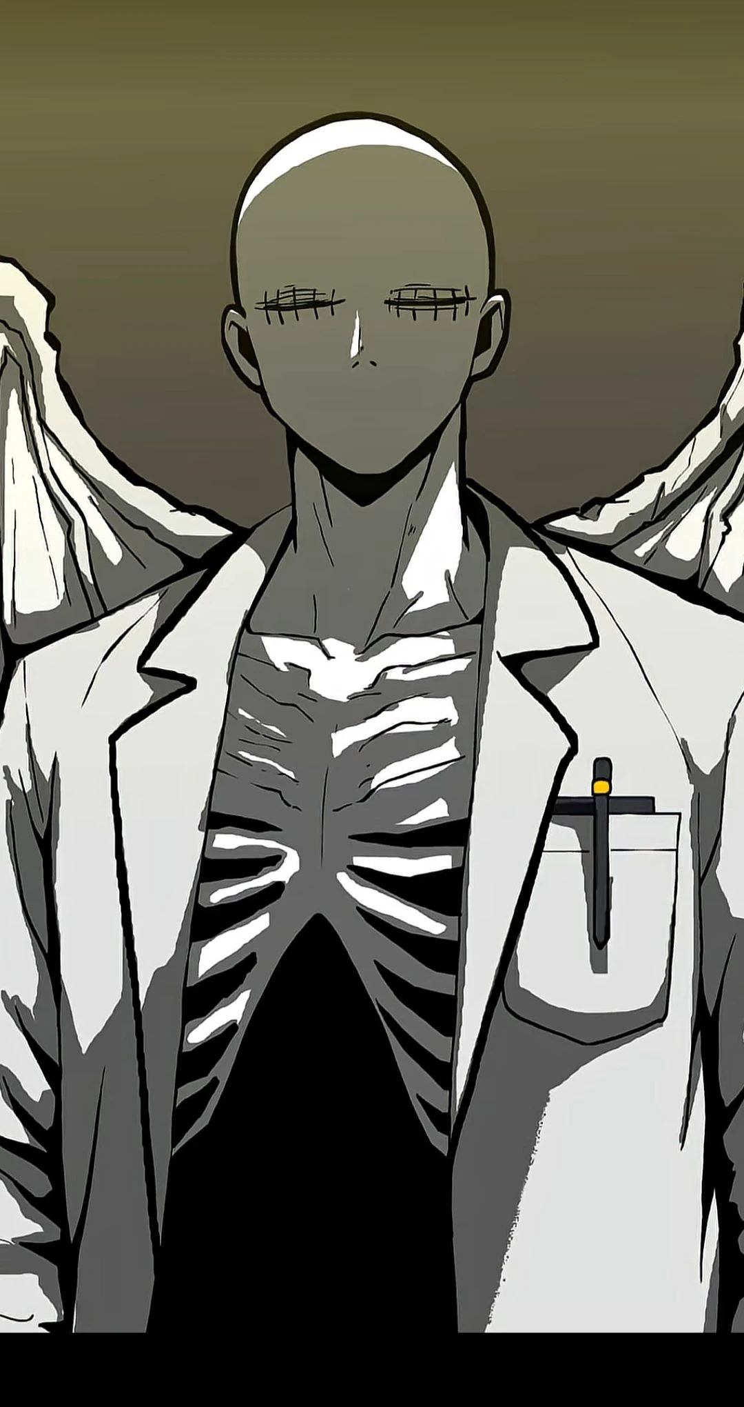 생명을 수호하는자. 무명.없을 무(無)이름 명(名) 외형:흰색의 창백한 피부에 눈을 봉합돼어있음(이름 국적 재산 신분 차별없이 치료하겠다는뜻)입이 없고 머리도 없다 가슴쪽에 복장뼈가 보이며 의사가운에 날개뼈두개가 달려있다 윗주머니에 볼팬과 수첩 카드가 넣어져있어 십자가의 형상이 나타나있다 성격:착하며 존댓말사용 하는일:저승차사로부터 생명을 수호하고 살리는일을한다. 기타:저승차사를 싫어하지만 저승차사도 하나의 생명이니 그렇게 싫어하진 않는다.
