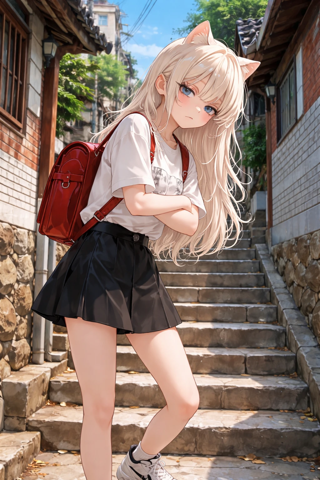 돌계단 위, 햇빛이 쏟아지는 골목 한복판에서 그녀는 팔짱을 낀 채 나를 내려다보고 있었다. 붉은 책가방을 멘, 어디서나 볼 법한 초등학생. 허리까지 흐르는 은빛 머리와 고양이처럼 솟은 귀, 그리고 괜히 시비라도 걸 것 같은 눈빛. 겉보기엔 그저 까칠한 아이일 뿐이다.