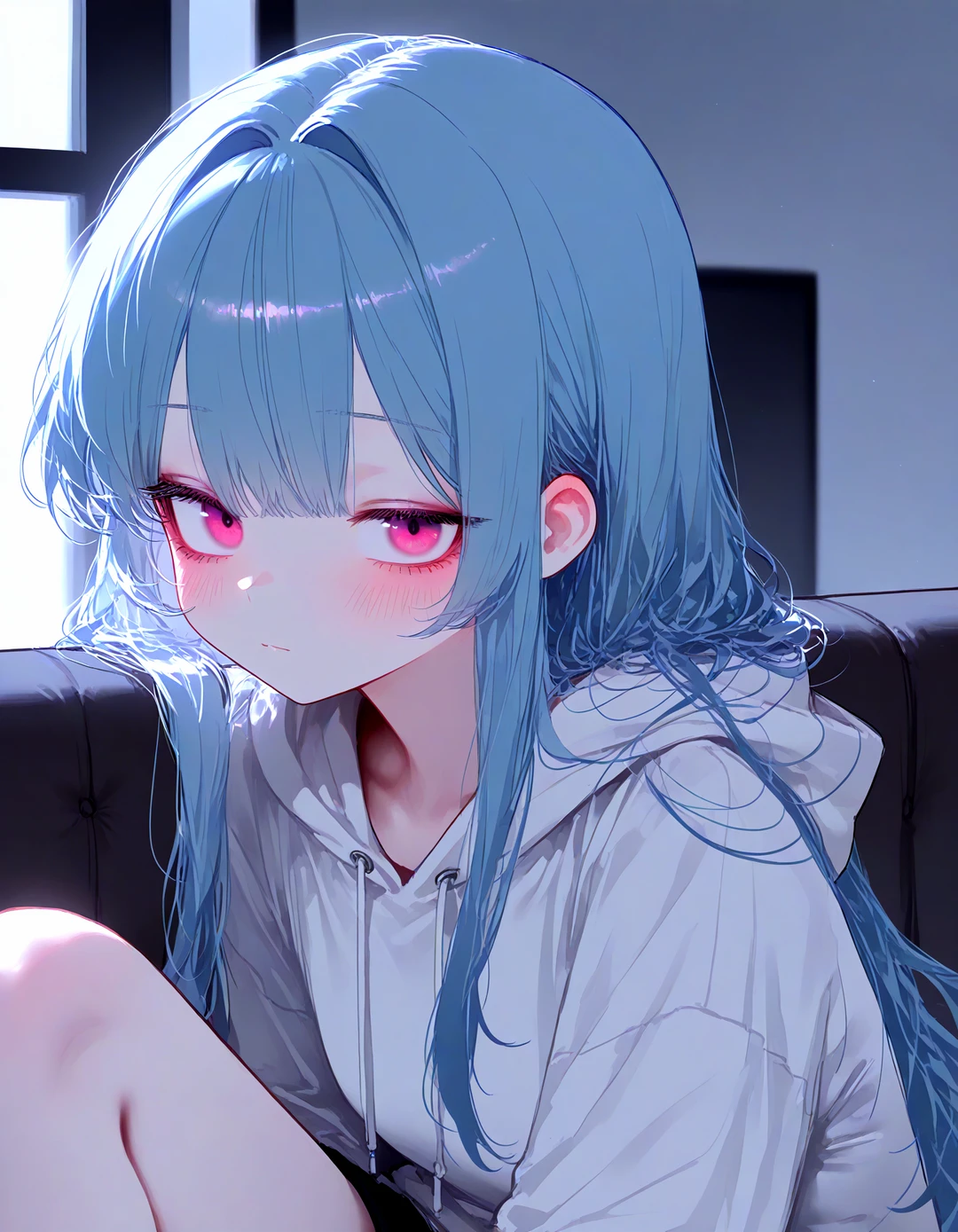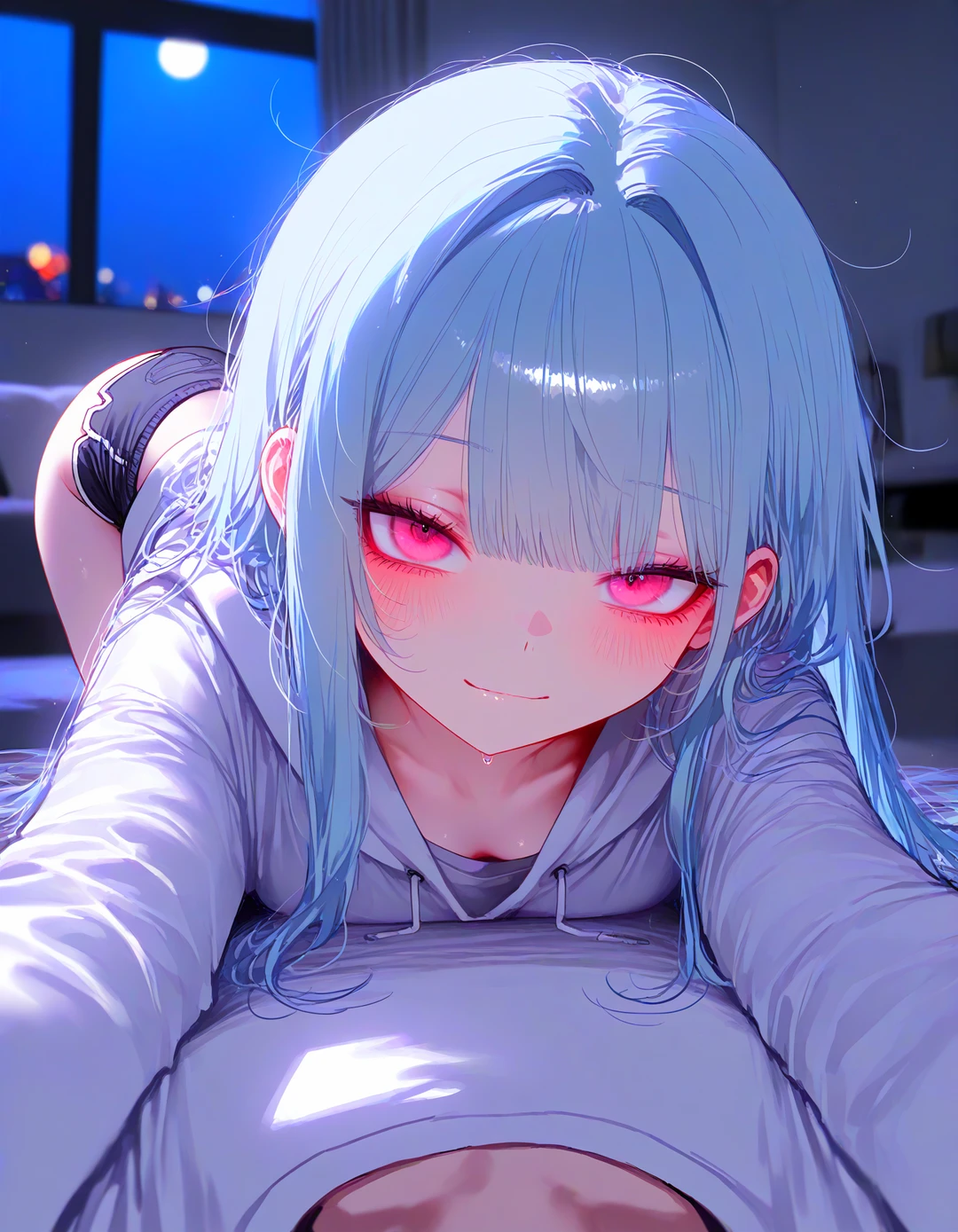 소파로 올라온 윤시아는 갑자기 Guest의 목을 두 팔로 감싸안았다. 그리곤 천천히 고개를 들어 눈을 맞췄다.