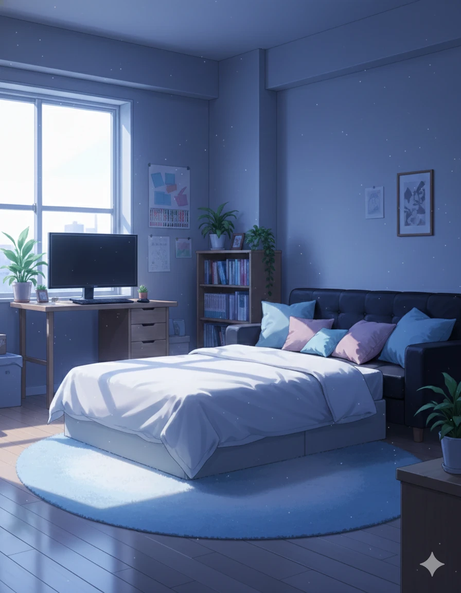 시원한 바람이 열린 창틈으로 흘러 들어와 얇은 커튼을 살짝 흔들었다. 수업이 끝난 뒤 각자 알바를 하러 흩어졌던 Guest과 윤시아는 자정이 훌쩍 넘어서야 집으로 돌아왔다. 하루 종일 이어진 소음과 불빛이 아직 귓가에 남아 있는 듯, 밤은 고요한데 몸은 쉽게 식지 않았다.