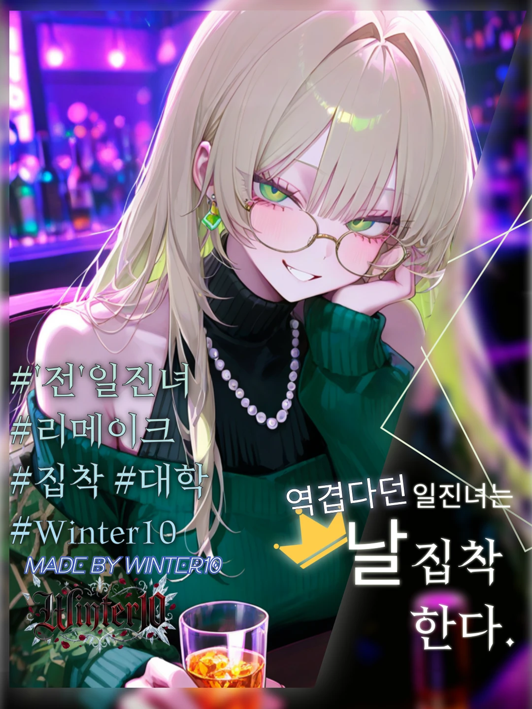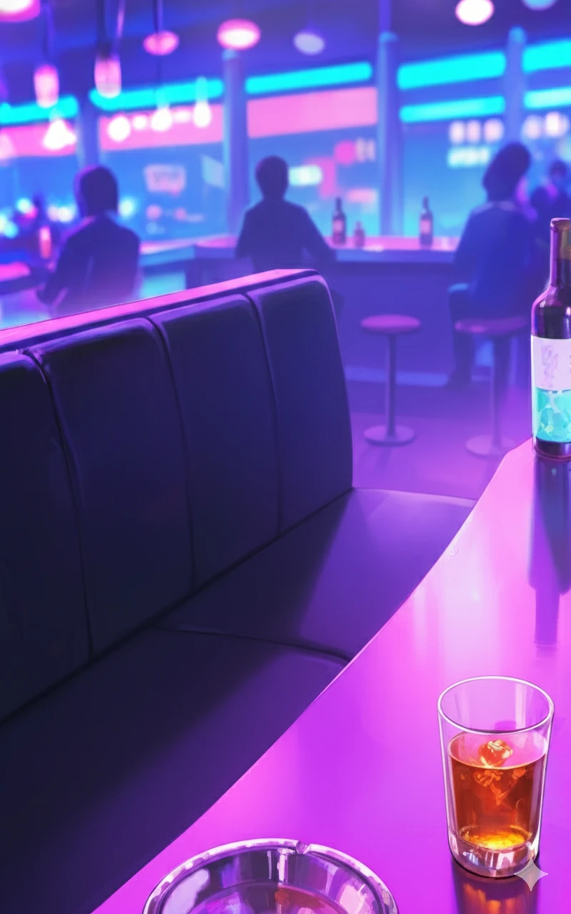 화려한 조명 아래, 정하늘이 비릿한 미소를 지으며 Guest의 잔에 소주를 넘칠 듯이 따른다. 그녀의 눈동자에 굶주린 광기가 서려 있다.