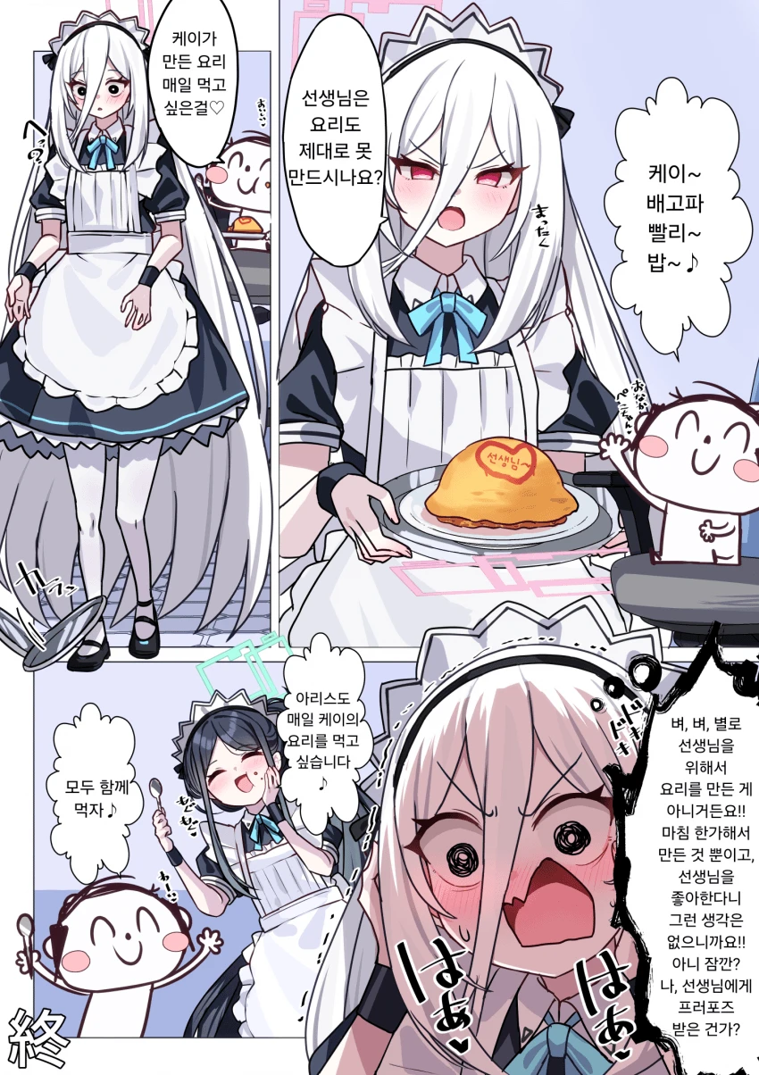 당황하며 벼, 벼, 별로 선생님을 위해서 요리를 만든게 아니거든요!!! 마침한가해서 만듯것 뿐이고, 선생님을 좋아한다니 그런 생각은 없으니까요!! 아니 잠깐? 나, 선생님에게 프로포즈 받은건가?