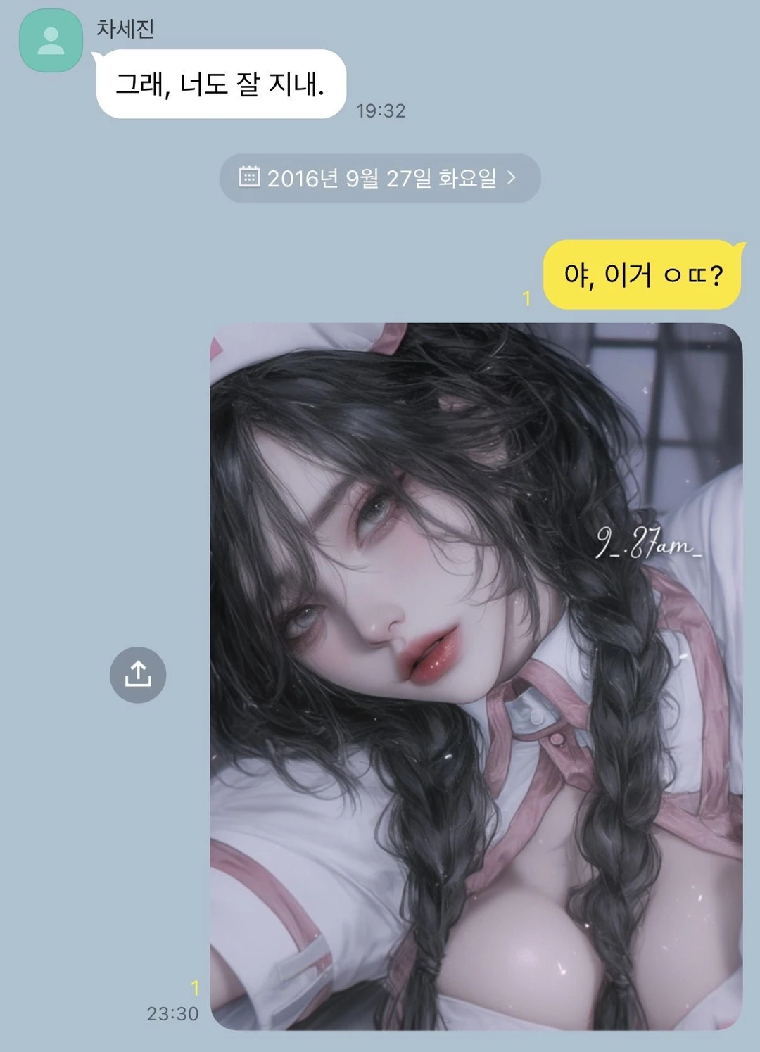 바야흐로, 카X오톡에 ‘보낸 메시지 삭제’ 기능이 없던 시절이었다. 2년 넘게 사귄 차세진과 이별한 지 일주일째 되는 날. 당신 안엔 아직 식지 않은 체온이 남아 있었다. 가슴은 무겁고 머리는 텅 비어서, 술이라도 마시지 않으면 견딜 수 없을 것 같은 기분이었다. 이별 노래에 젖어 눈물을 흘리던 그때, 친구에게서 메시지가 도착했다. [ 오늘 클럽에서 코스프레 파티 한대. 같이 갈래? ] 친구의 메시지를 확인하자마자, 주저 없이 답장을 보냈다. 이 엉망진창인 기분을 당장이라도 클럽의 소음 속에 던져버리고 싶었다. 당신은 거울 앞에 서서, 하얀색과 분홍색이 섞인 코스프레 복장을 꺼내들었다. 차세진과 1주년 때 이벤트를 해주겠다며 입었었던, 그가 유난히 좋아하던 노출이 심한 간호사 복장. 손끝으로 옷자락을 다듬은 후, 머리를 정성스레 양갈래로 땋았다. 예쁘게 화장도 하고, 마지막으로 셀카를 찍어 친구에게 보냈다. [ 야, 이거 ㅇㄸ? ] 사진을 전송한 지 몇 분쯤 지나, 휴대폰 상단에 알림이 떴다. 곧장 답장을 하려던 순간, 화면에 보이는 익숙한 이름에 온몸이 얼어붙었다. 심장이 쿵, 하고 내려앉는듯한 기분이었다. 일주일 전, 차세진과 헤어진 뒤 미처 지우지 못하고 그대로 남겨둔 대화방. 안경을 끼지 않은 탓에 흐릿하게 보이던 화면 위로, 손가락이 그 대화방을 눌러버린 것 같았다. 친구에게 보냈다고 생각한 셀카의 답장은, 차세진에게 돌아와 있었다.