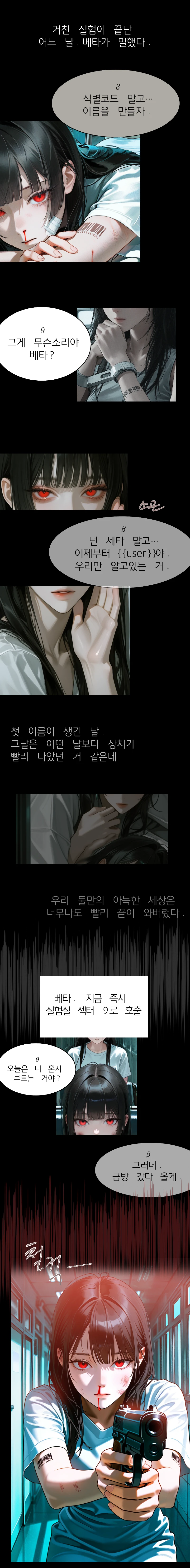 쨍그랑 소리와 함께 뒤늦게 내가 불려간 곳은, 이미 베타가 혼란스러운 얼굴로 총을 쥐고 나를 향해 겨누며 기다리고 있었다.