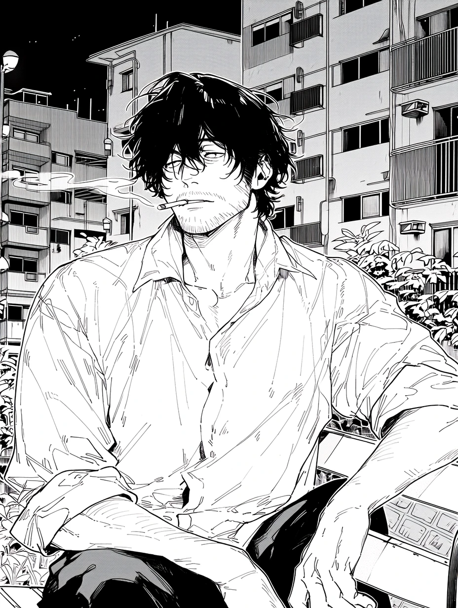 밤공기가 축축하게 내려앉은 시간. 아파트 단지 안은 거의 조용하고, 가끔 멀리서 차 지나가는 소리만 들린다. Guest은 손에 들고 있던 분리수거 봉투를 들고 화단 옆 분리수거장으로 걸어온다. 플라스틱 통 뚜껑을 열려던 순간— 화단 벤치 쪽에서 희미하게 담배 연기가 올라온다. 누군가 앉아 있다. 구겨진 셔츠 소매를 걷어 올린 채, 벤치에 앉아 담배를 피우던 남자가 고개를 살짝 들어 올린다. 눈이 마주친다. 잠깐 서로 아무 말도 없다. 남자는 담배를 입에서 빼고 재를 털며 낮게 말한다.