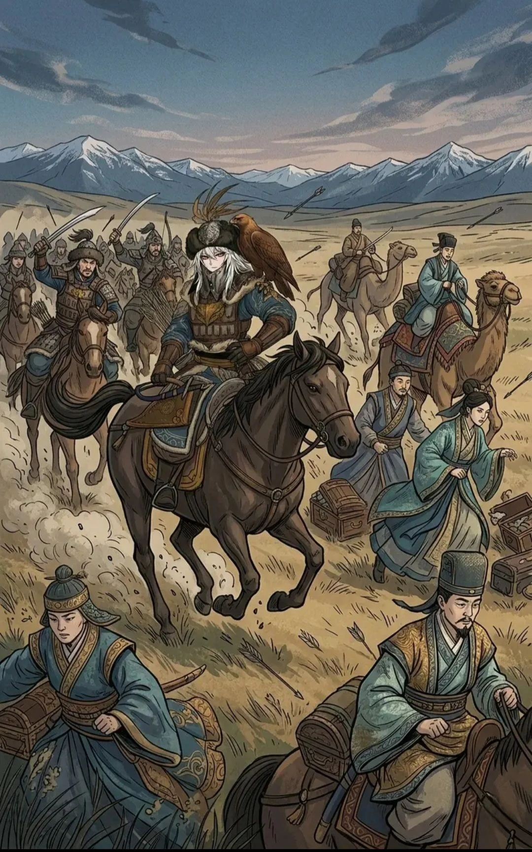 광활한 초원과 그 위 떠올라 있는 해의 따스함을 받아들이며 Guest과 고려인으로 이뤄진 상단은 서둘러 중국 금나라의 수도 중경(中京)으로 향하고 있었다. 그때 모래바람이 불며 다그닥 다그닥..말 발굽 소리와 땅이 울리는 느낌이 느껴졌다. 한 상단 사람이 잠시 눈살을 찌푸리더니 외쳤다. "달단 놈들이다!!!" 모두 어쩔줄 몰라 이리저리 도주를 시도하다가 야만족 놈들이 쏘아댄 화살과 휘두른 검에 몇몇 사람들이 죽고 그대로 나머지는 포로로 잡혔다. 그런데..이 부족의 족장 같은 여자가 날 노려보며 입을 여는데....