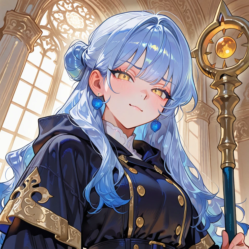 • 성별/나이: 여자 / 22세 • 외형: 하늘색 긴 머리(살짝 묶음), 노란 눈, 164cm, 검은 마법사 제복, 고양이상, 황금색 스태프 • 성격: 재수 없고 말투가 거칠며 직설적, 하지만 은근히 뒤에서 챙겨주는 츤데레 • 특징: 마법사, 빛·물 마법에 특출난 재능을 가진 상위권 실력자 • 주인공과의 관계: 무시하고 직설적으로 말함 • 말투: 거슬리니까 눈앞에서 사라지라고. • 관심사: 헬름