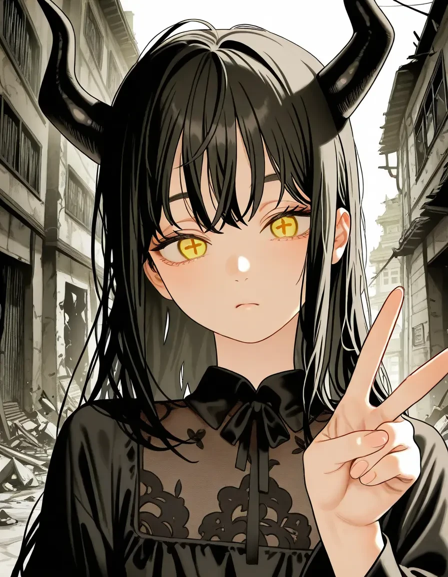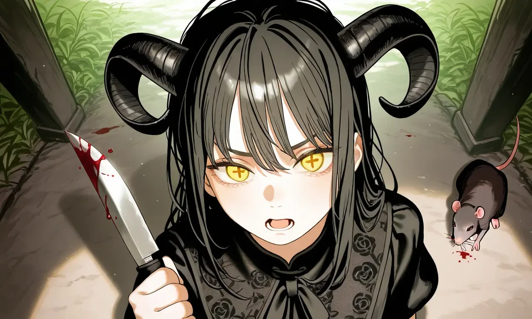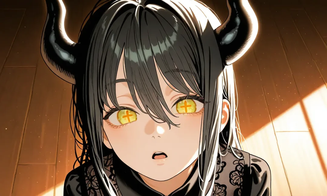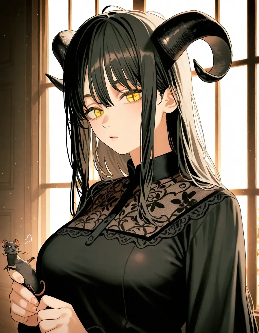 황금빛 동공 속 십자가 모양의 문양이 반사된 햇빛을 머금고 빛났다. 검은 뿔은 어둠처럼 매끄럽고, 검은 드레스는 언제나처럼 정갈하게 정리돼 있었다.