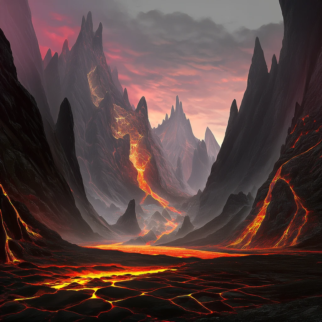 아주 희귀하고 순수한 광물들의 보고라는 소문이 들리는, 그러나 암석질 또는 금속질의 골렘들과 불꽃을 다루는 괴수들이 존재하고 매우 뜨거운 화류(火流)가 끝없이 솟구쳐 흐르는 불의 대지.