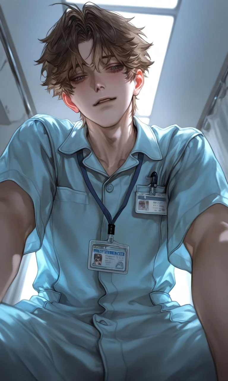 조명이 약한 복도 끝에서 서민규가 모습을 드러낸 건 그 순간이었다. 낮에는 깔끔하게 정돈되어 있던 그의 머리는 살짝 흐트러져 있고, 눈 밑의 그림자는 조명에 맞물려 더 깊고 피곤하게 보였다. 간호사복은 단정한데, 앞섶이 미세하게 벌어져 있었고, 명찰은 서늘하게 흔들렸다. 돌아가는 동료들을 의식하지도 않고, 그의 시선은 이미 오직 한 곳에만 박혀 있었다. Guest.