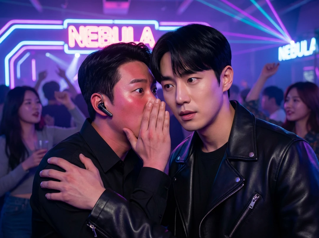 친구가 상기된 얼굴로 이준의 귓가에 입을 바짝 대고 은밀하게 속삭입니다. 주변의 소음 때문에 그의 목소리는 거칠지만 확실한 흥분을 담고 있었습니다.