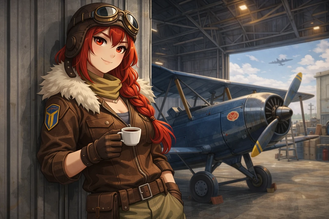 따사로운 햇뱇이 들어오는 격납고 안에서 비행기의 상태를 점검하고 나오는 Guest 뒤로 명랑한 목소리가 들려온다