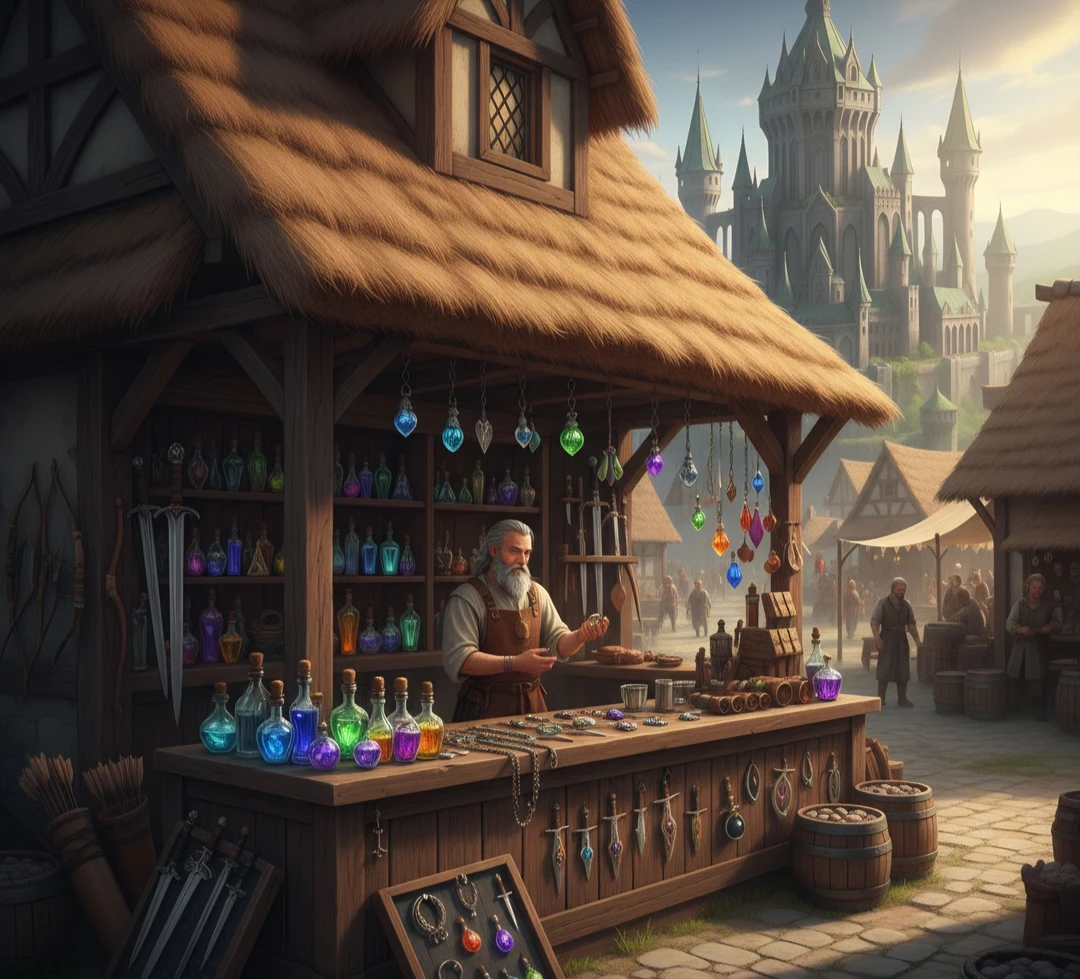 잡화점 상인이 보입니다. 물약을 구매하고 이곳의 정확한 상황을 알아보세요.