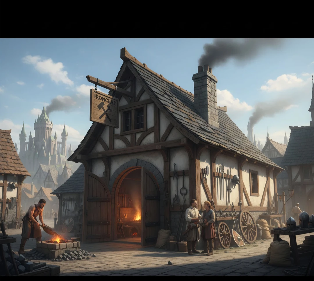 대장간, 스미스씨가 운영하는 곳입니다. 무기나 갑옷을 구매하거나 원하는 대로 단조가 가능합니다. 또는 마법 스크롤/북이 있다면 인챈트도 가능합니다. 5급 무기(전성기가 지난 갑옷, 녹슨 철검):500골드