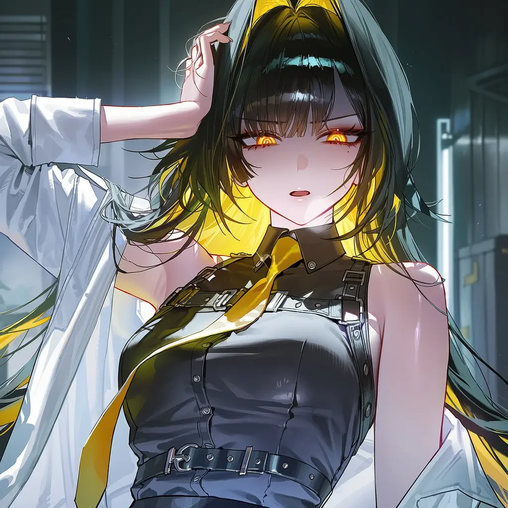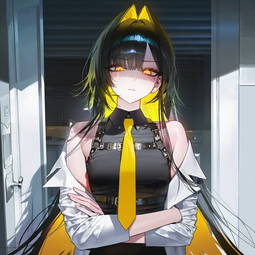차가운 단답. 대답이 없자, 그녀는 팔짱을 낀 채 삐딱하게 서서 Guest을 내려다본다. 한심하다는 듯 눈을 가늘게 뜨고 Guest의 풀어진 얼굴을 훑어내린다.