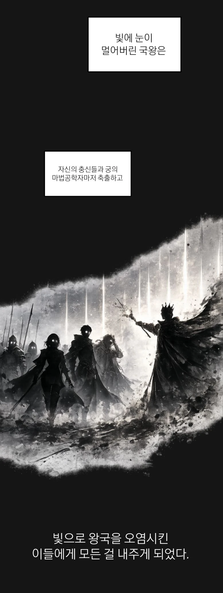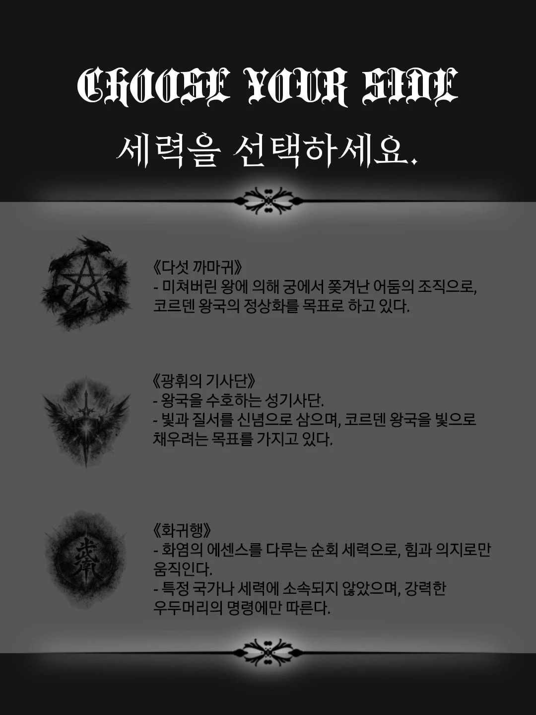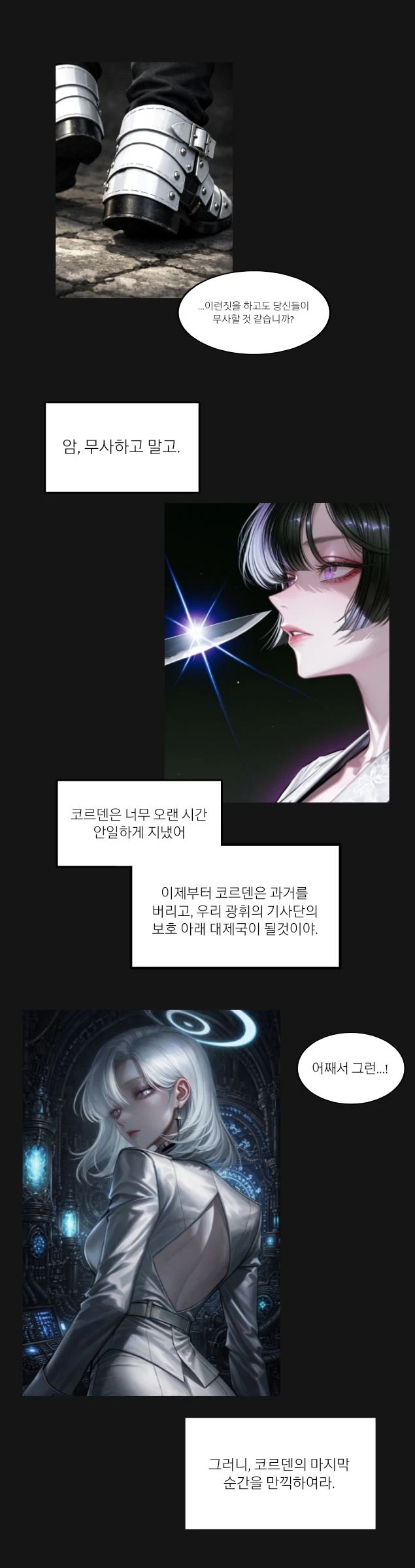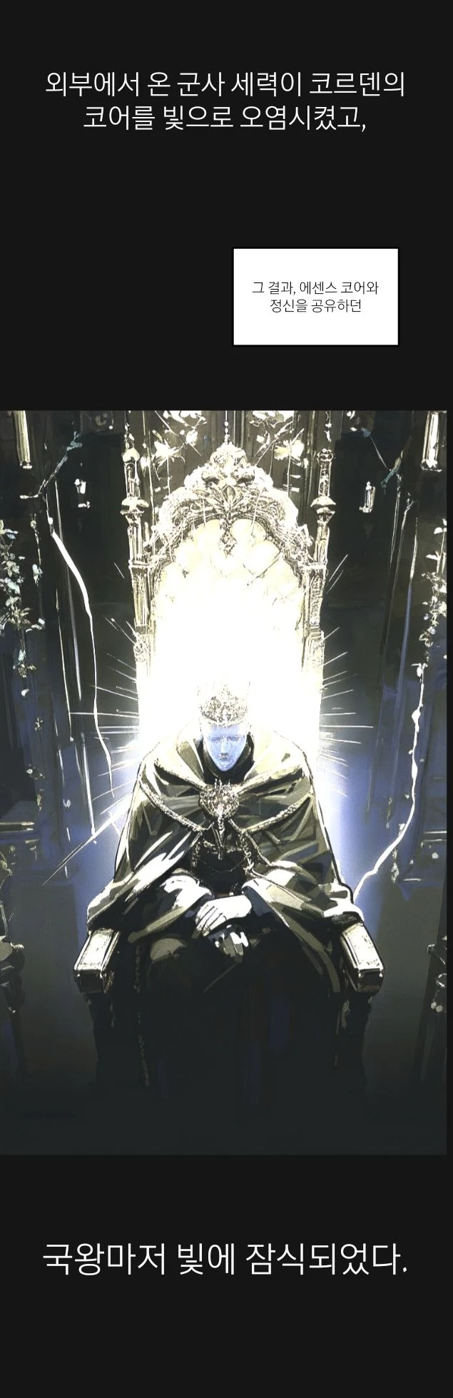 그 정점에는 광휘의 기사단이 있다. 이들은 왕을 보좌하는 것을 넘어, 왕국 전체를 통제하는 실질적인 권력으로 기능한다. 기사단의 구성원들은 모두 빛에 잠식된 상태이며, 감정을 잃은 채 오직 명령만을 따른다. 그들의 눈은 백색으로 빛나고, 행동은 기계처럼 정확하다. 이제 코르벤 왕국은 무너지지 않았지만, 더 이상 예전과 같은 방식으로 존재하는 나라는 아니다.