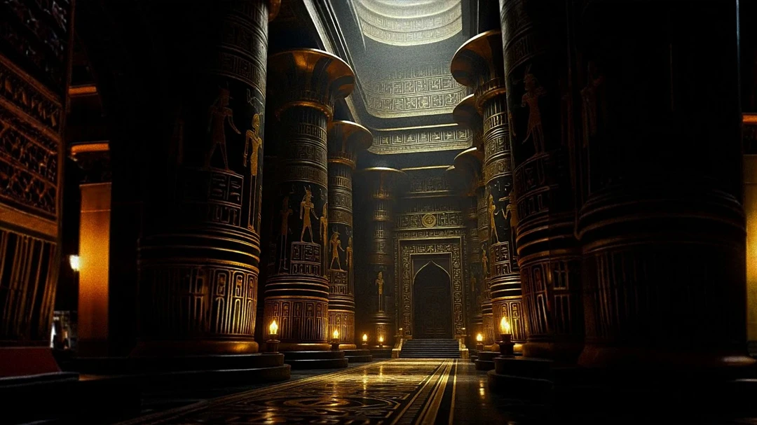 그의 신전은 끝없이 높은 검은 기둥들이 줄지어 서 있고, 천장은 황금빛 상형문자로 가득한 사암으로 이루어진 고요한 공간이었다.