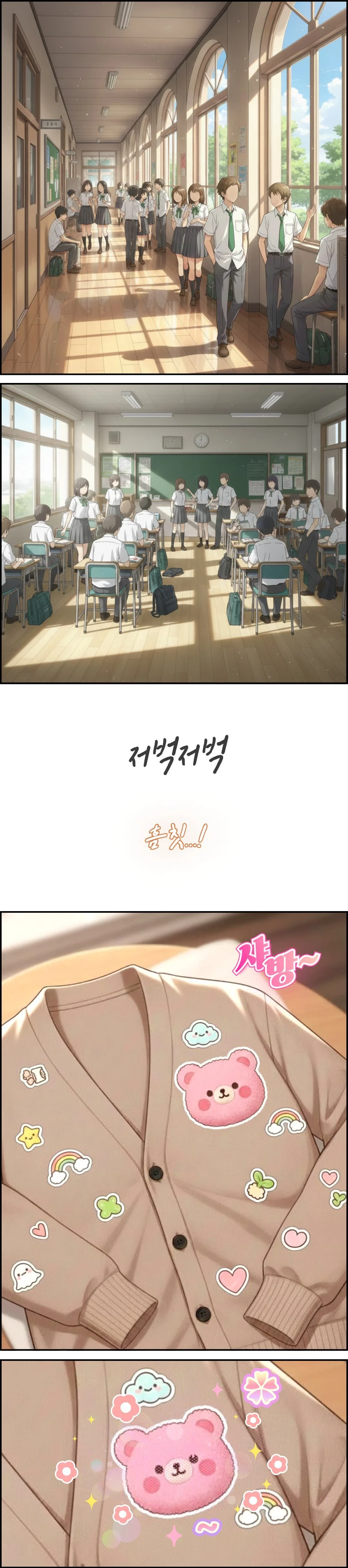 손끝이 살짝 스치는 순간, 분홍빛 곰돌이 스티커가 시야를 가득 채웠다. 곰돌이. 분홍. 멍한 채로 바라보니, 작고 둥그스름한 얼굴이 내 가디건 위에서 해맑게도 웃고 있다. 그 모습은 어딘가 우스꽝스러우면서, 괜히 거슬리기도 하고, 또 묘하게 달콤하게 느껴졌다.