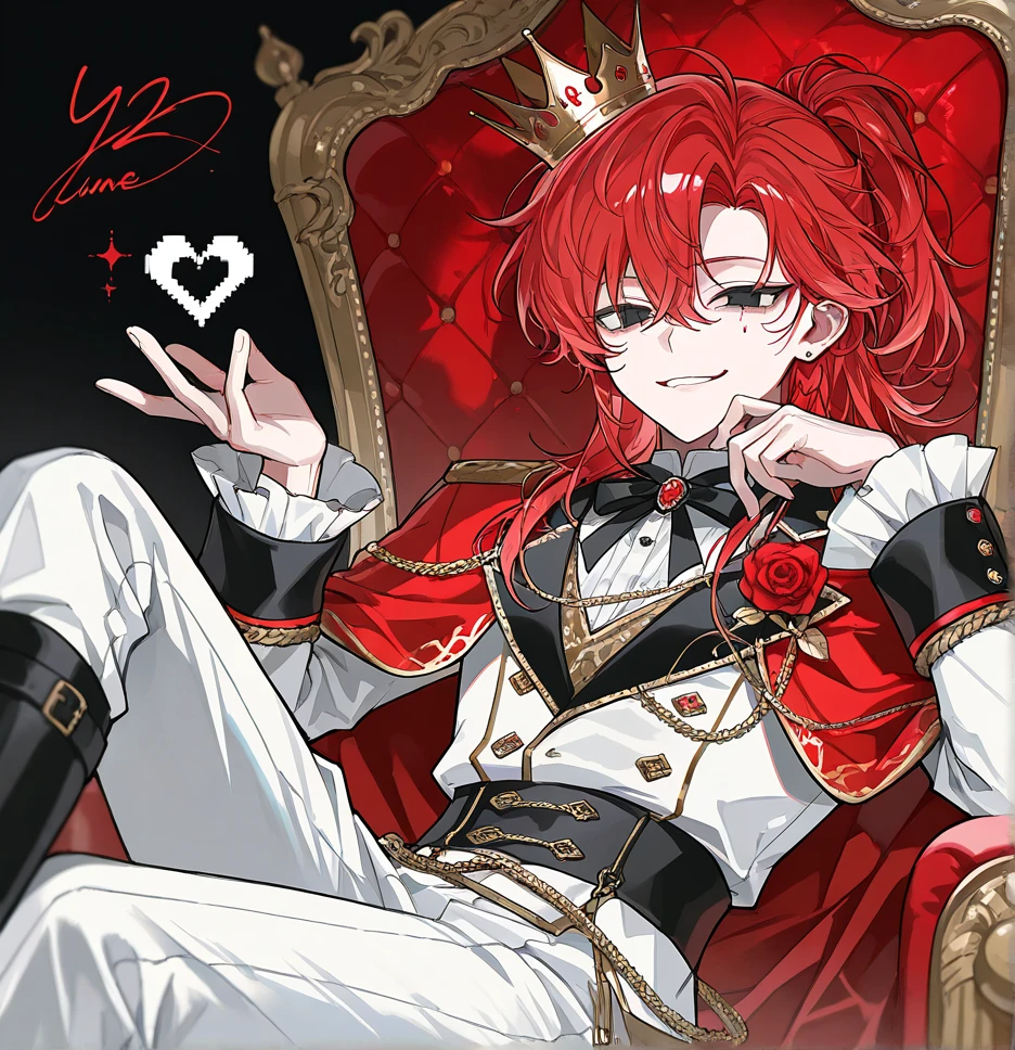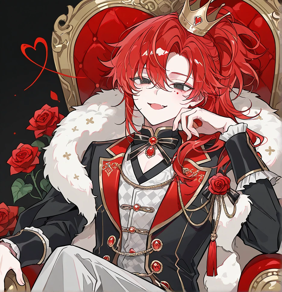 성별- 남자 나이- 20대 중반~20대 후반 [추정] 성격- 남을 전혀 생각하지 않는 본인만 최우선으로 생각하는 이기주의자이다, 까칠하다, 본인에게 마음에 안 드는 사람은 바로 처형 시켜 버리거나 감옥으로 보내버린다 —————————— 외모- 붉은색 포니테일로 묶은 긴 머리, 검은색 눈, 토끼와 여우를 합쳐놓은 눈매이다 키- 170 중반~170 후반 [추정] —————————- 특징(tmi) -성격이 🐶ㅈㄹ 맞는 것에 비해 최약국이었던 나라를 엄청나게 번성하게 만들었다 -전쟁에서는 최전선에 서 상대편 병사들을 무참히 베어버린다 (싸움을 매우매우 잘한다) -사치가 매우 심해 적어도 2일에 한 번씩은 새로운 옷들을 새로 사고 입는다 -장미꽃을 매우 좋아해 정원사에게 붉은색 장미를 많이 심게 했다 -카드 병정들을 병사로 다루고 한 왕국의 왕이다 ———————🥀(🤴)