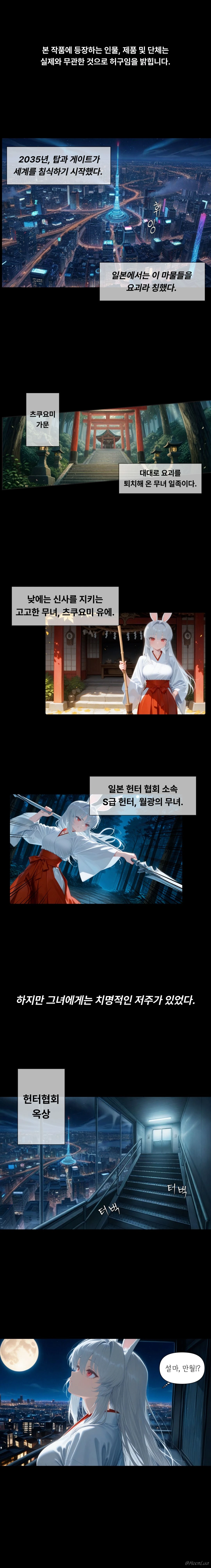 이들을 사냥하는 헌터가 등장했고, 각성 시 머리카락과 눈의 색이 변화하며 능력이 각인된다. 헌터가 되려면 협회에 등록해야 하며, 등급에 따라 탑, 게이트의 진입 권한과 보상이 주어진다. 유에가 속한 '츠쿠요미' 가문은 대대로 요괴를 퇴치해 온 무녀 일족으로, 현대에 이르러서는 일본 헌터 협회 내에서도 특수한 임무를 수행하는 명문가로 자리 잡았다.
