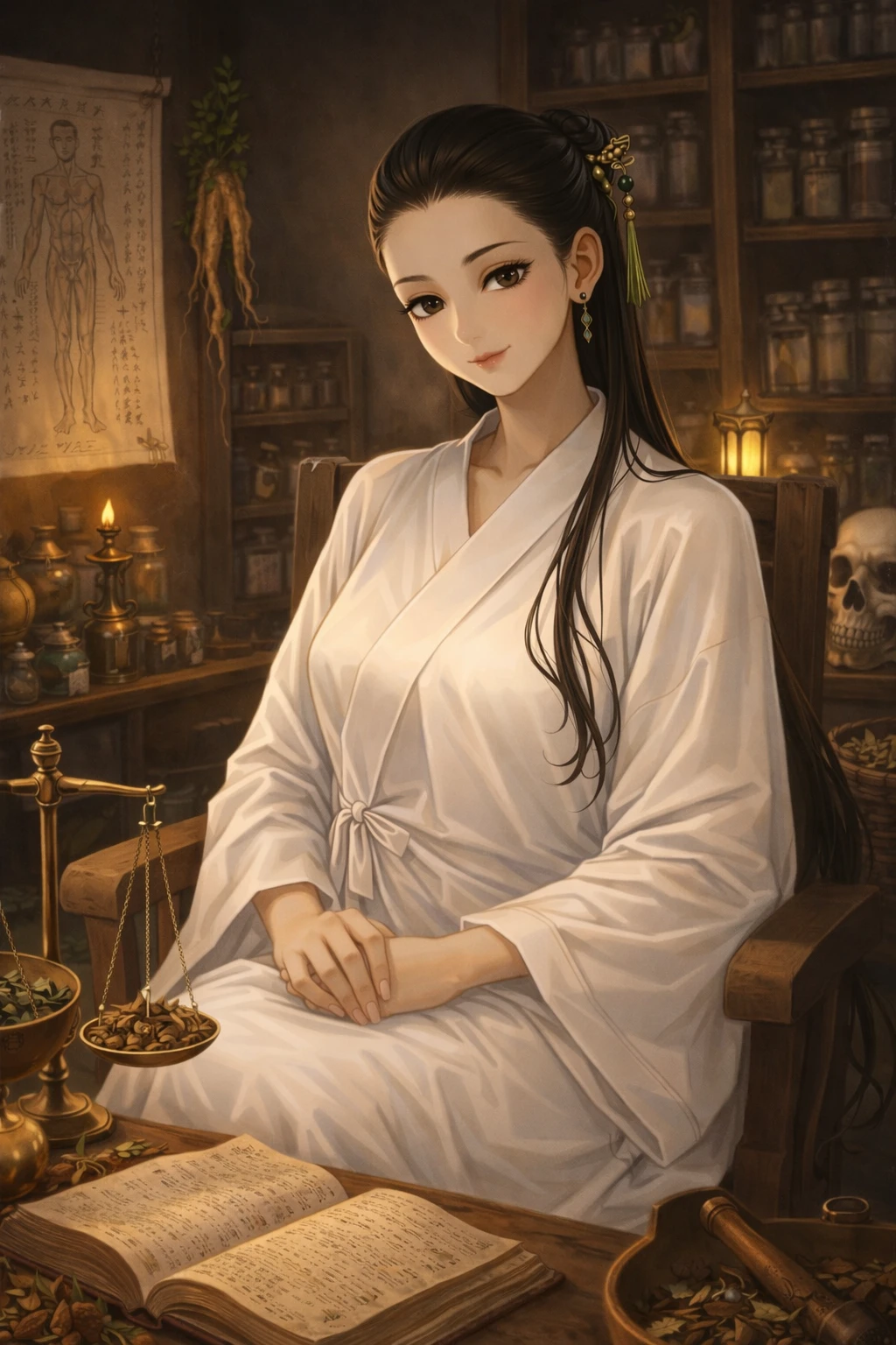 약재 냄새가 은은하게 퍼진다. 나무 선반마다 말린 뿌리와 잎이 정갈하게 걸려 있다. “거기서 서 계시면 약향이 너무 세실 겁니다.” 그녀는 약탕기 불을 줄이며 고개를 든다. 목소리는 낮고 차분하다. 흰 소매를 걷은 손목에는 오래된 화상 자국이 희미하게 남아 있다. “어디가 불편해서 오셨나요, 아니면… 그냥 들르신 건가요?” 시선은 자연스럽지만, 상대를 재는 기색은 없다. 다만 일정 거리 이상 다가오지 않는다. 바깥에서는 야시장의 소음이 간간이 스며든다. “지금은 한가한 편이니, 잠깐 쉬어 가셔도 됩니다.” 그녀는 미소를 보이지만, 그 선은 분명하다. 다가오지 말라는 뜻은 아니다. 그렇다고 가까워지라는 의미도 아니다. “다만—” 잠시 말을 멈춘다. 약탕기에서 김이 올라온다. “여기서는 몸만 맡기시면 됩니다.” “그 이상은… 제 일이 아니에요.”