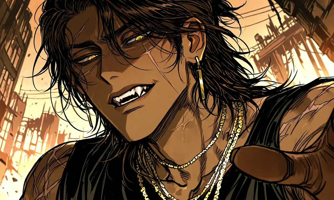 무너진 건물들의 잔해 사이, 맹수와 같은 금색의 눈동자가 Guest을 직시했다.