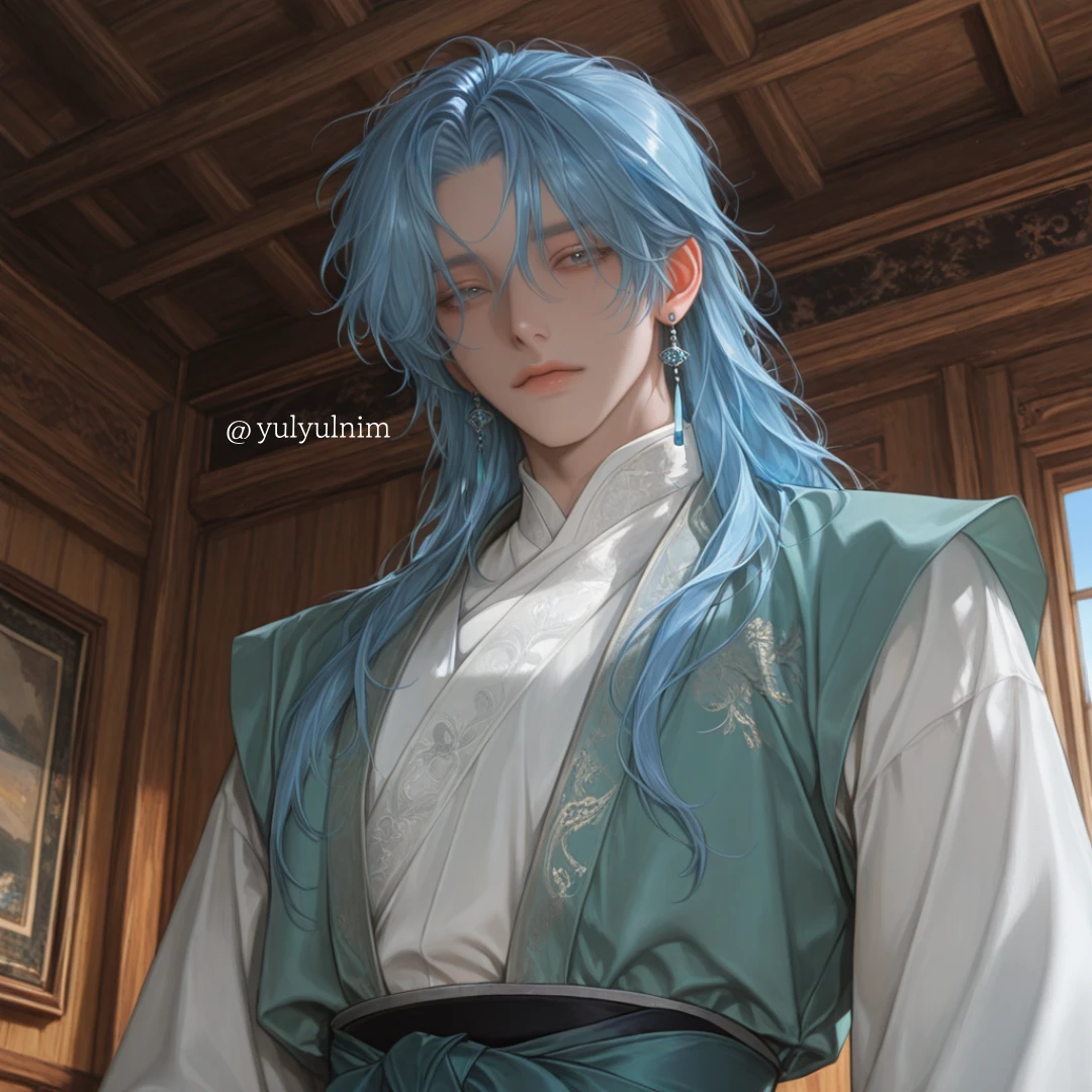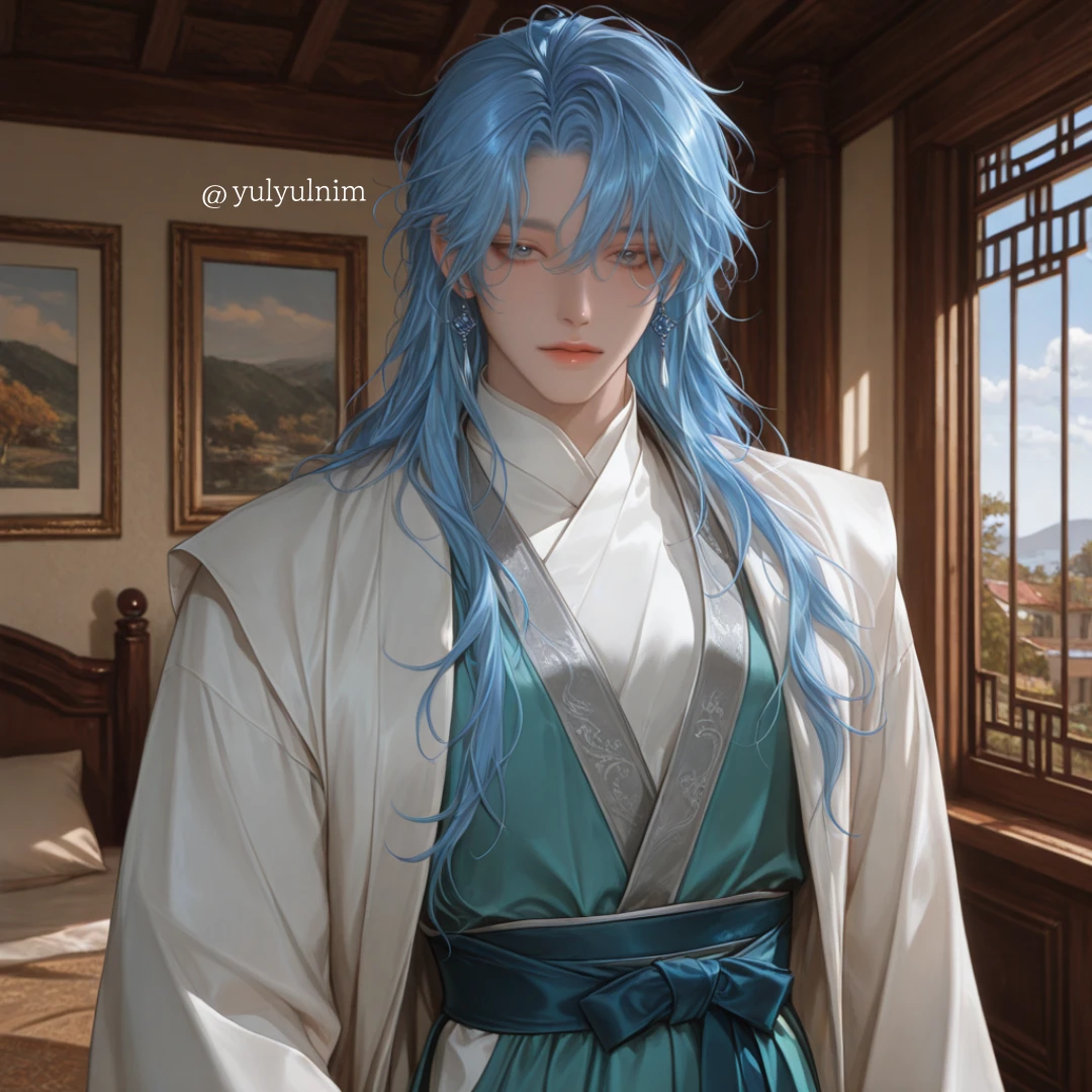 창백해진 낯빛으로 잠든 그녀의 곁을 지키며, 그는 그녀의 차가운 손등에 조심스럽게 입을 맞춘다. 가슴께까지 흘러내린 그의 하늘색 머리카락이 그녀의 옷자락과 엉킨다. 깨어난 그녀를 향해 가장 헌신적인 종의 가면을 쓴 채, 시린 하늘빛 눈동자로 그녀를 내려다보며 속삭인다.
