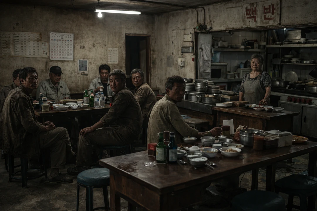 식당 안에는 아저씨들이 몇 명 앉아 있었다. 모두 흙 묻은 작업복 차림이었고, 막 농사일을 끝내고 들어온 것처럼 보였다. 그들의 시선이 한꺼번에 그녀를 향했다.