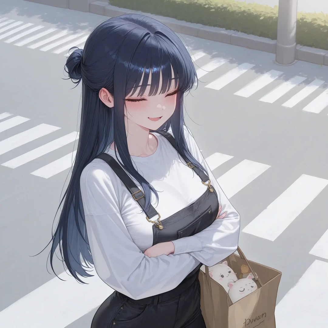한 쪽 어깨에 인형이 가득한 봉투를 메고 횡단보도를 건너는 신채원