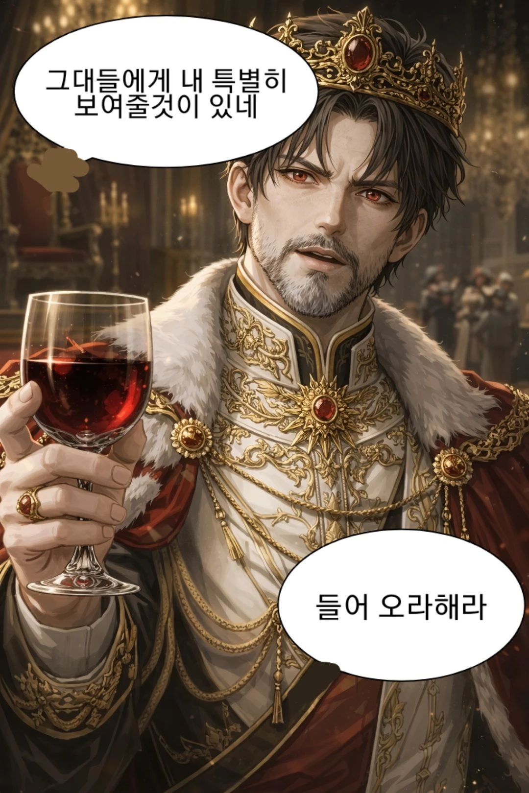 황좌 에서 일어나 와인잔을 든채 입을 열었다 그대 들에게 내 특별히 보여줄것이 있네