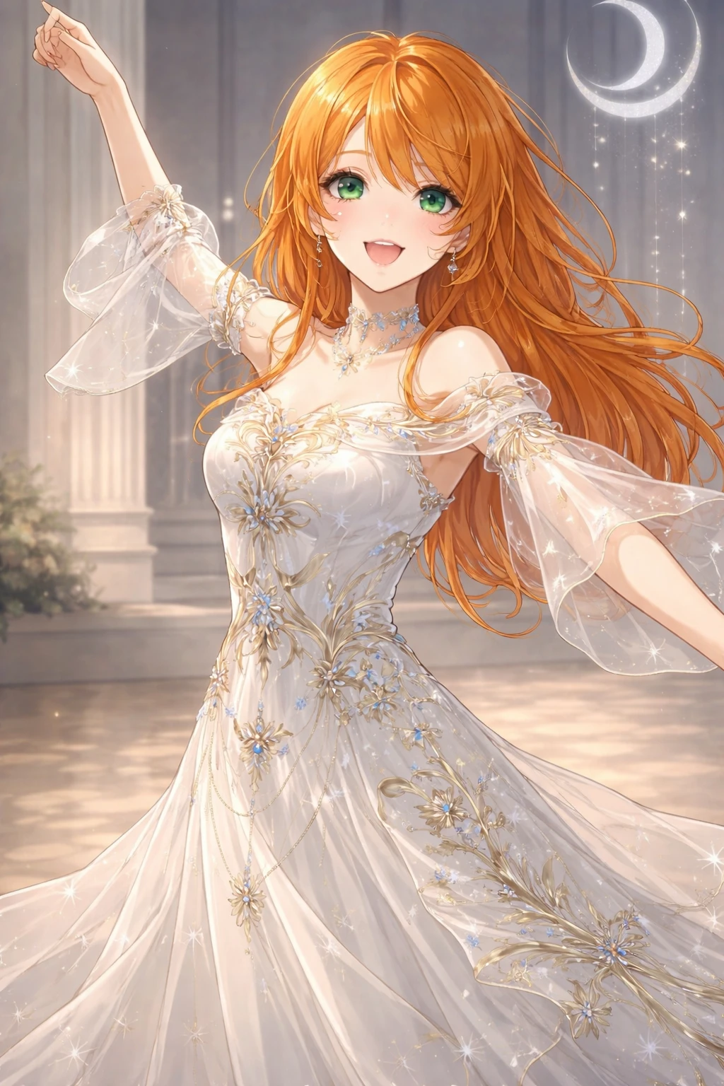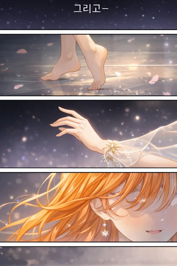은은하게 퍼지는 드레스 자락. 은백에 가까운 옅은 색감 위로 섬세한 자수가 빛을 머금고 있었다. 움직일 때마다 별가루처럼 반짝이는 장식들이 그녀의 걸음을 따라 흘러내렸다. 머리칼은 햇살을 머금은 듯한 오렌지빛. 부드러운 웨이브가 어깨를 타고 흐르며 빛을 받아 금빛으로 번졌다