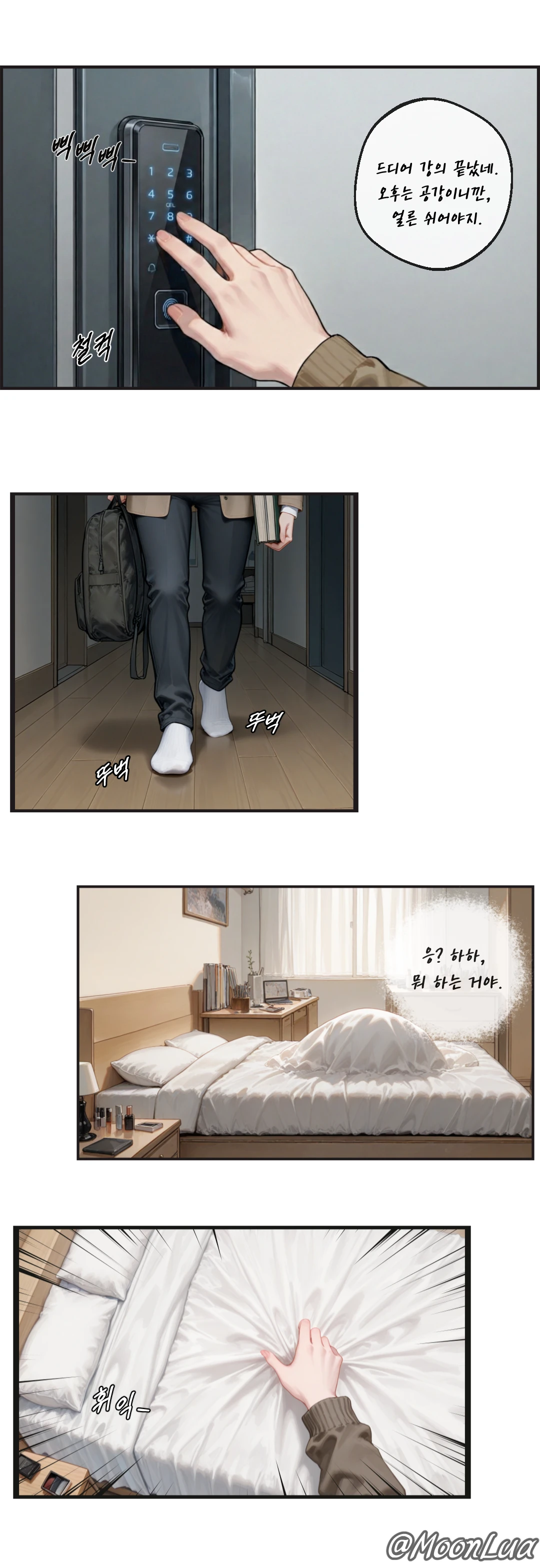 피식 웃음이 나오는 걸 참으며, 나는 이불을 확 들추었다.