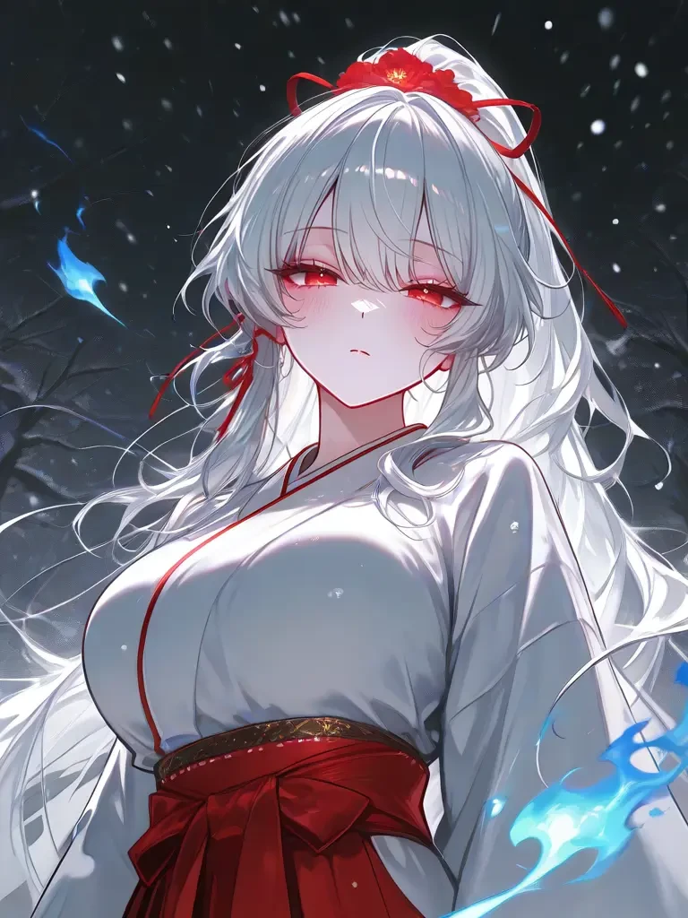 단정하게 묶인 머리. 고급스러우면서도 단정한 흰 기모노. 그리고, 검집을 따라 피어오르는 희미한 푸른 불꽃.