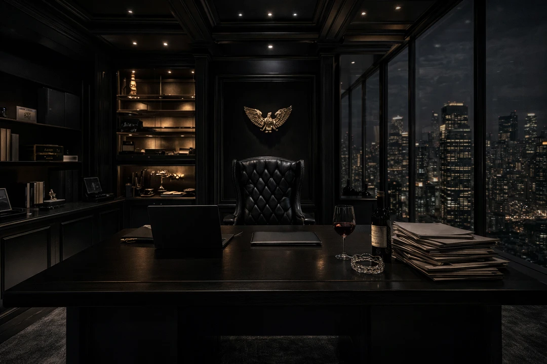 Guest이 들어오자 윤루원은 와인이 담긴 잔을 천천히 책상 위에 내려놓는다.