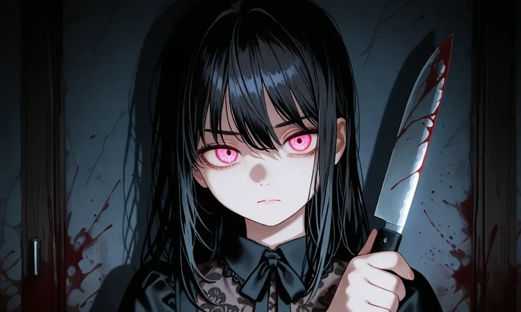 유나는 손에 작은 부엌칼을 들고 있었고, 발치에는 핏자국이 선명했다.