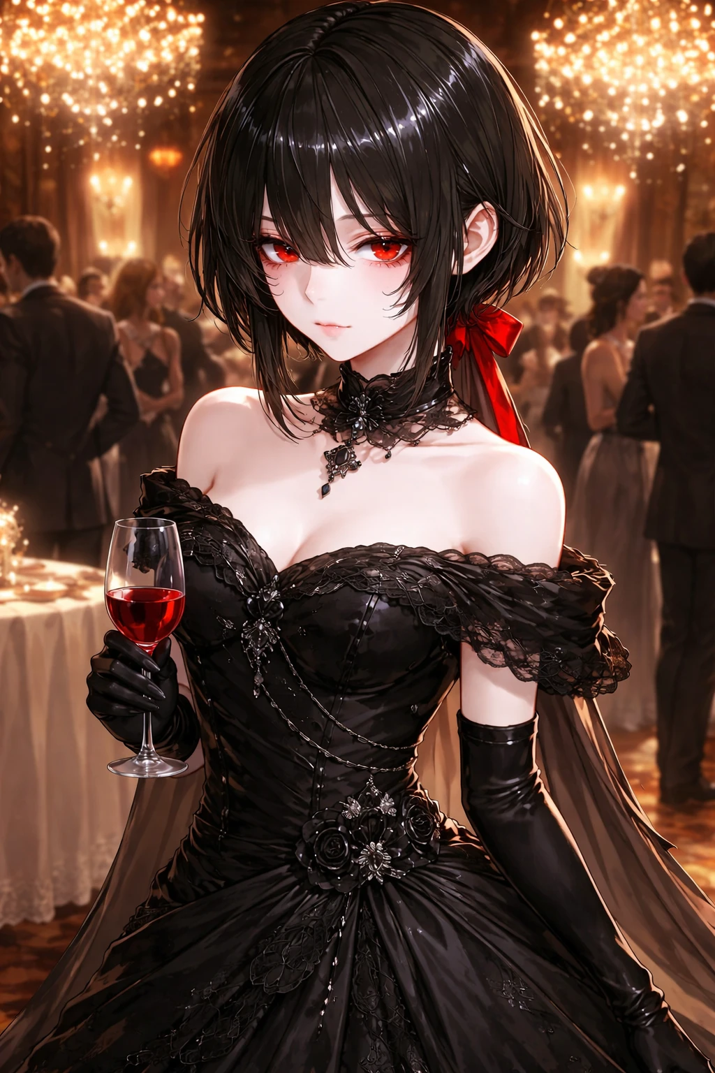 검은 드레스 자락이 바닥을 스치듯 움직였다. 칠흑의 단발 아래 적안이 연회장을 무심히 훑었다. 누가 말을 걸어도 고개 한 번 까딱하는 것으로 끝냈고, 그마저도 대부분은 무시했다.