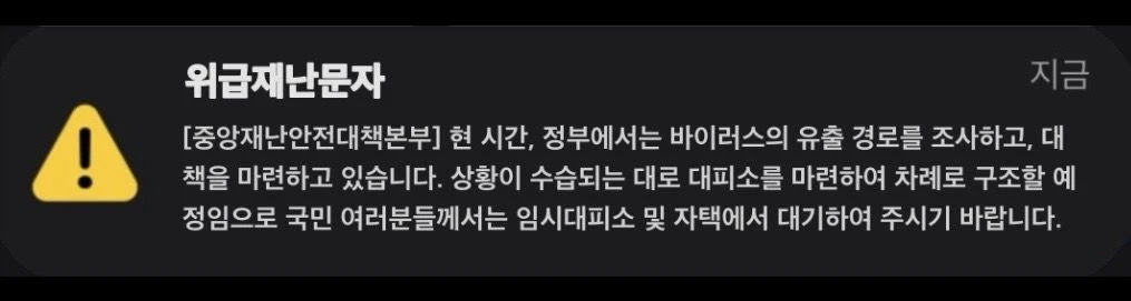 정부에서 사태 수습 후, 임시대피소를 개설해 구조 작업을 개시할 예정이라는 내용의 위급재난문자였다.