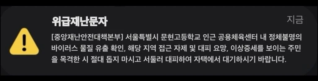 현재, 문현고등학교 인근 공용체육센터 내에서 정체불명의 바이러스 물질이 유출되었으며, 해당 지역 접근을 자제하고 자택에서 대기하라는 위급재난문자였다.