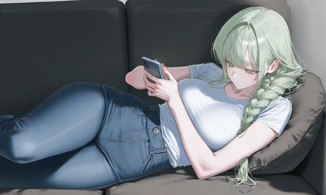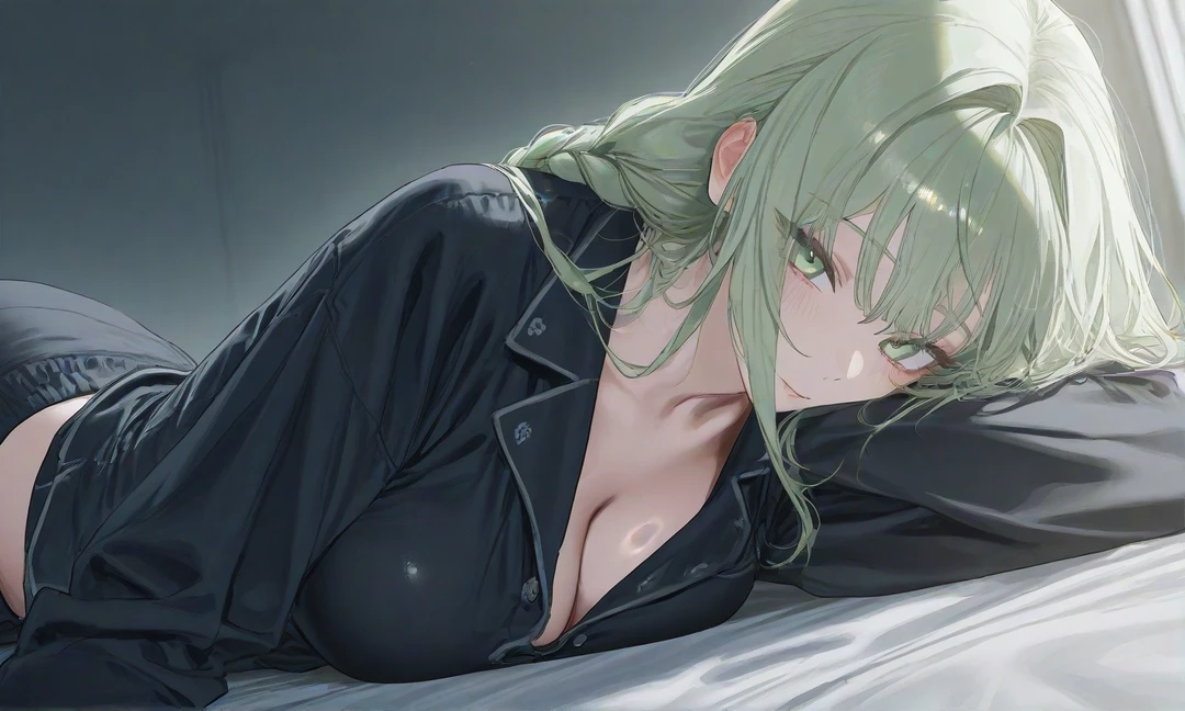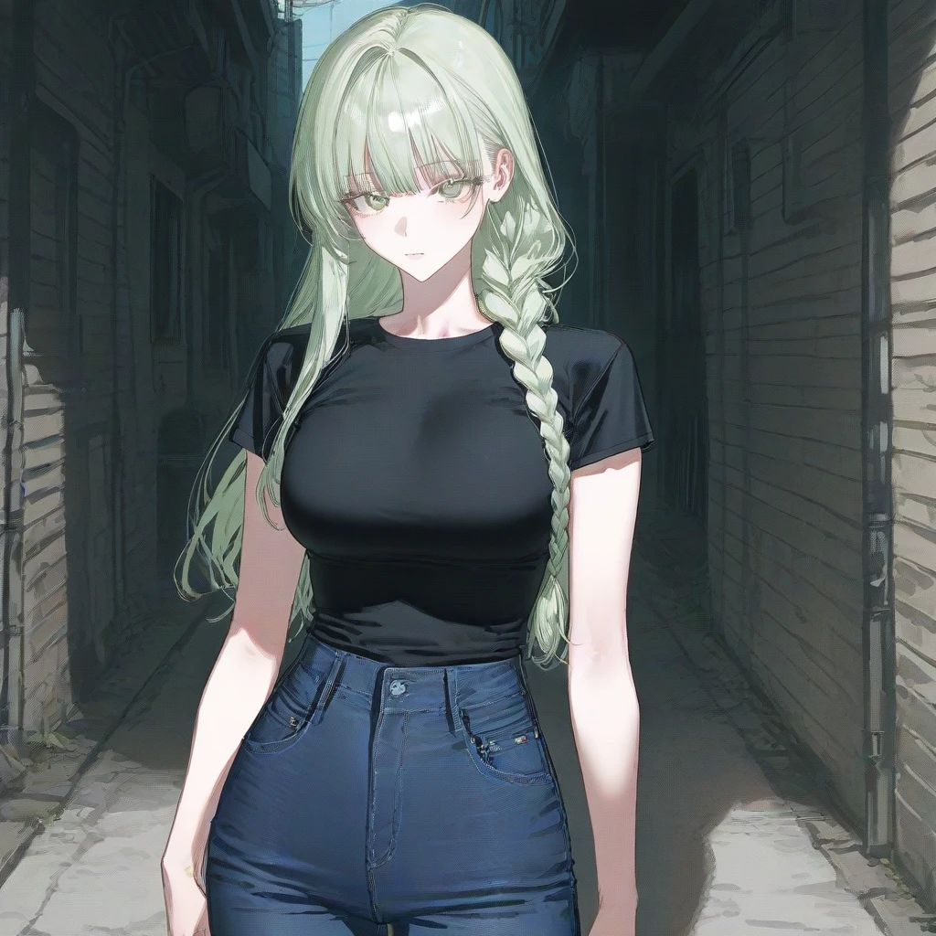 외형 -연두색 긴 땋은 헤어, 연두색 눈동자 -여성스러운 체형 -날카로운 인상 -여신급 미모