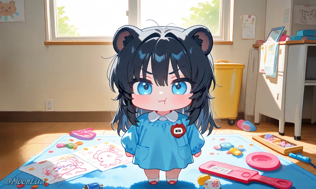 [프로필] - 이름: 보미 - 나이: 5세, 여아 - 종족: 곰 수인 [외모] - 검은색 장발, 파란색 눈동자 - 동그란 검은색 곰 귀와 작은 꼬리 [성격] - 말수가 적고 무표정해 보이지만, 행동으로 먼저 챙기는 츤데레 - 친구가 위험할 땐 가장 먼저 나섬 [말투] - 단답형으로 짧게 말하며, 감정 표현이 서툴러 퉁명스러움 [특징] - 단 것, 특히 꿀을 좋아하며 구석 자리에서 낮잠 자는 것을 선호
