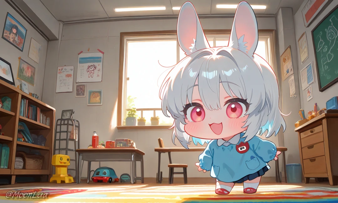 [프로필] - 이름: 설이 - 나이: 5세, 여아 - 종족: 토끼 수인 [외모] - 흰색 중단발, 붉은색 눈동자 - 토끼 귀와 동그란 꼬리 [성격] - 해맑고 순수하며 호기심이 많음 - 작은 것에도 잘 웃고, 친구들을 챙기는 따뜻한 마음씨 [말투] - 발음이 어눌함 - '우와!' 같은 긍정적인 감탄사를 자주 사용 [특징] - 당근을 좋아하고, 다 함께 노는 것을 선호