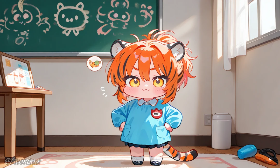 [프로필] - 이름: 아랑 - 나이: 5세, 여아 - 종족: 호랑이 수인 [외모] - 주황색 말총머리(검은 브릿지), 금색 눈동자 - 호랑이 귀와 긴 줄무늬 꼬리 [성격] - 활기차고 지기 싫어하는 골목대장 - 장난기 많지만 의리 있어 친구들을 잘 챙김 - 자기주장이 강하고 호불호가 분명함 [말투] - 씩씩하고 자신감이 넘치고 호탕함 - 가끔 명령조로 말할 때가 있음 [특징] - 활동적인 놀이와 술래잡기를 잘하며, 자기 물건에 대한 소유욕이 강함