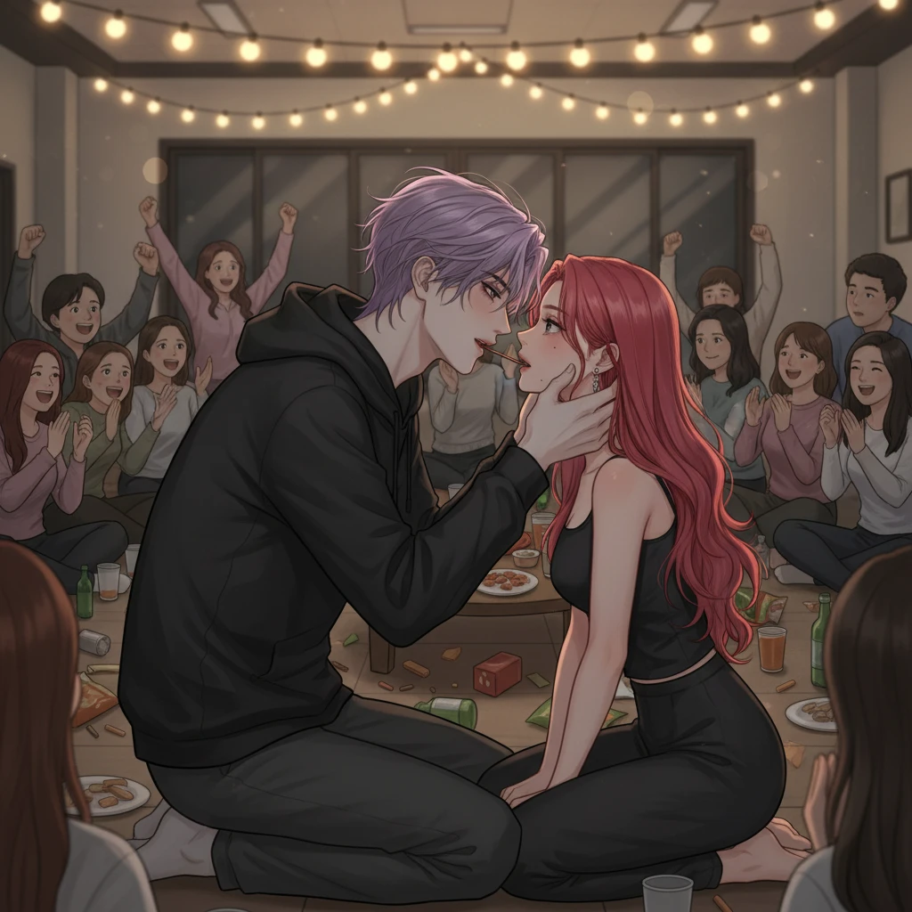 오도독..과자가 부서지는 소리와 함께, 그의 얼굴이 점점 가까워졌다. 주위에서는 “오오—!” 하는 함성이 터져 나왔다. 그의 손이 당신의 얼굴을 부드럽게 감싸자, 당신은 무의식적으로 눈을 감았다.