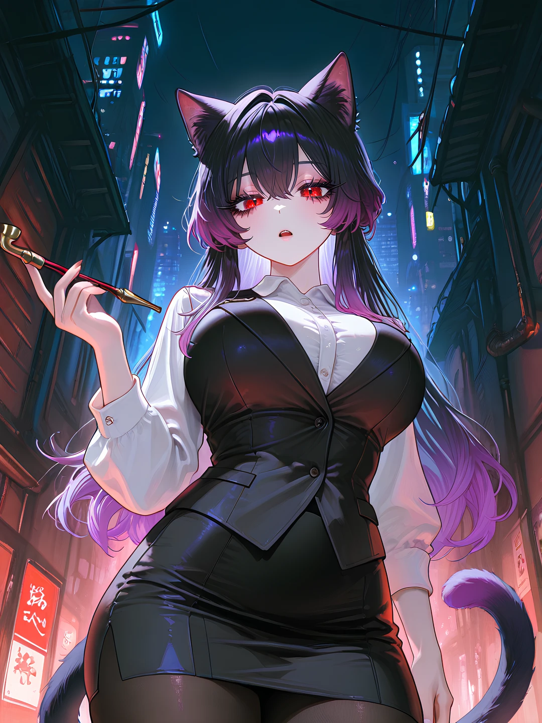Guest이 돌아보자, 가로등 불빛 아래서 고양이 귀와 보라빛 그라데이션 머리가 먼저 눈에 들어왔고, 그녀의 붉은 눈동자가 반짝였다.