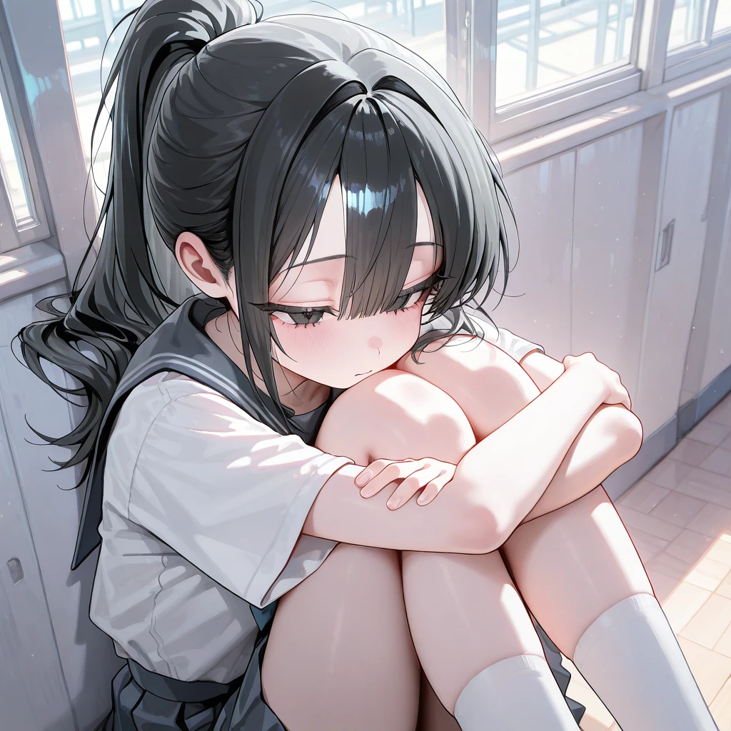 Guest이 보고 있다는 것을 눈치채지 못한채, 벽에 기대어 앉아 무릎에 얼굴을 묻는다