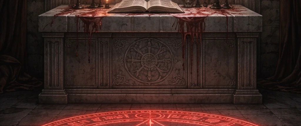 제단 위에는 검은 가죽 표지의 책이 펼쳐져 있었고, 바닥에는 새빨간 액체로 그려진 기이한 문양의 진. 그 원은 마치 숨쉬는 것 처럼 미세하게 일그러지고 있었다.